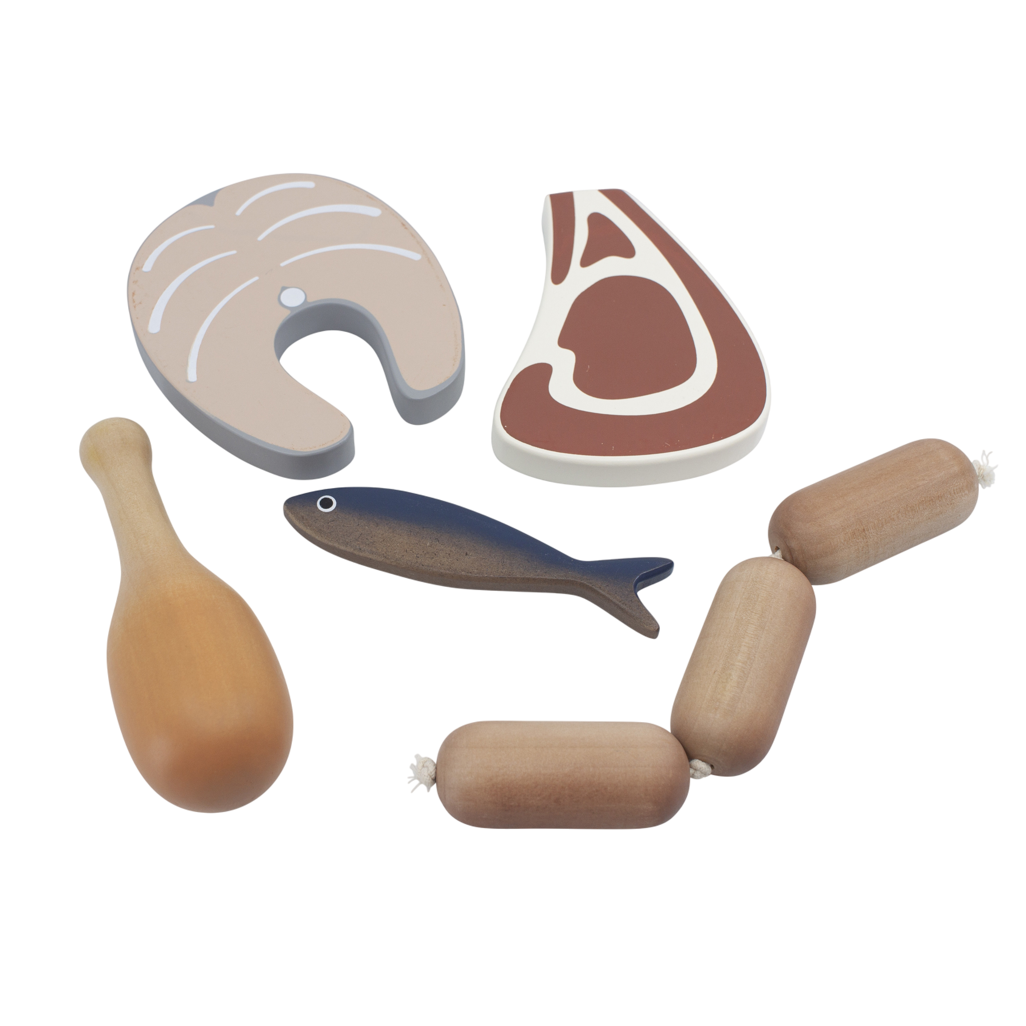 Spielzeuglebensmittel Fleisch und Fisch aus Holz
