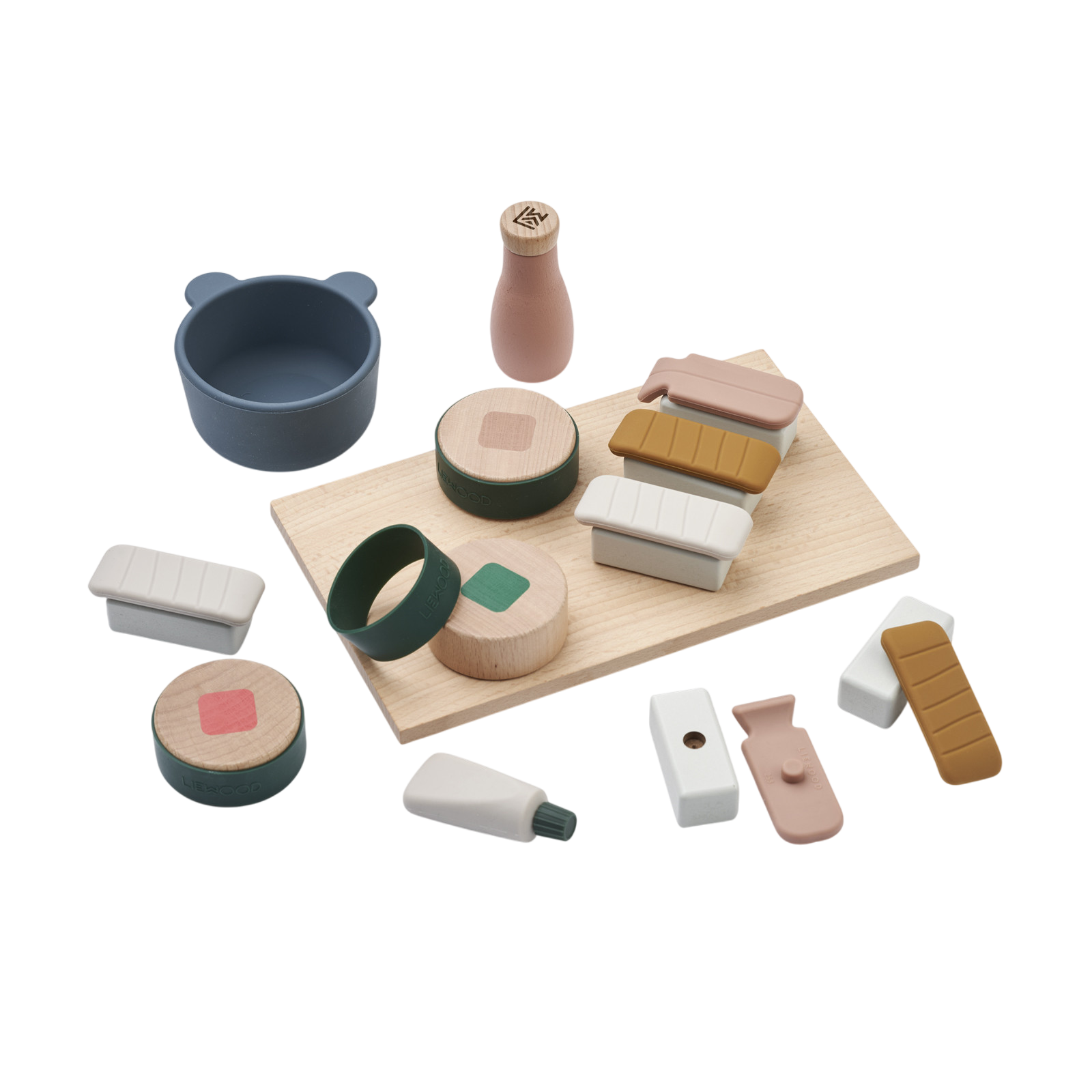 Spielzeuglebensmittel Kuchen und Kekse aus Holz