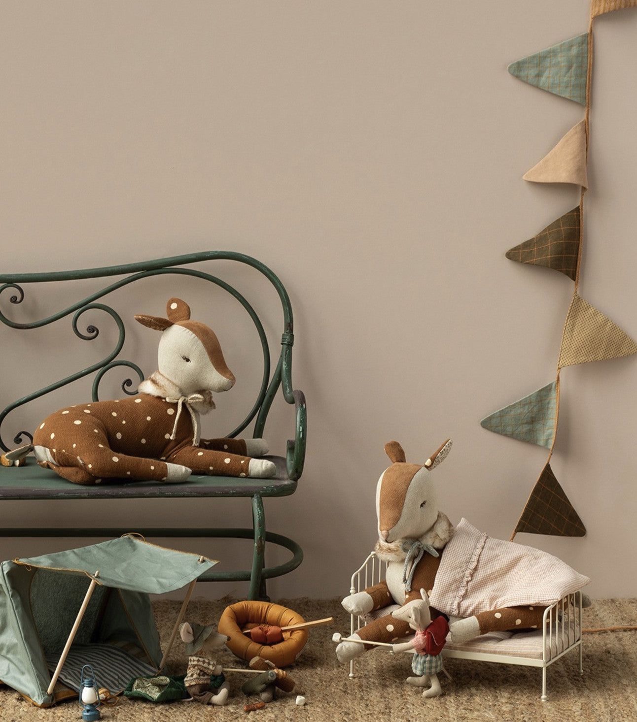 On a cold winter's night, when the stars are twinkling and the wind is blowing through the trees, little Maileg Bambi is resting in a warm room. With its soft fur and gentle eyes, it seems to whisper stories of peaceful forests and safe hiding places. This affectionate creature not only invites you to cuddle it, but also to dream of adventures in snow-white landscapes where there is always room for imagination and role play. Whether it's vacations in the mountains, train journeys through snow-covered forests or long car journeys during the Christmas season - this Bambi makes time fly by when traveling.