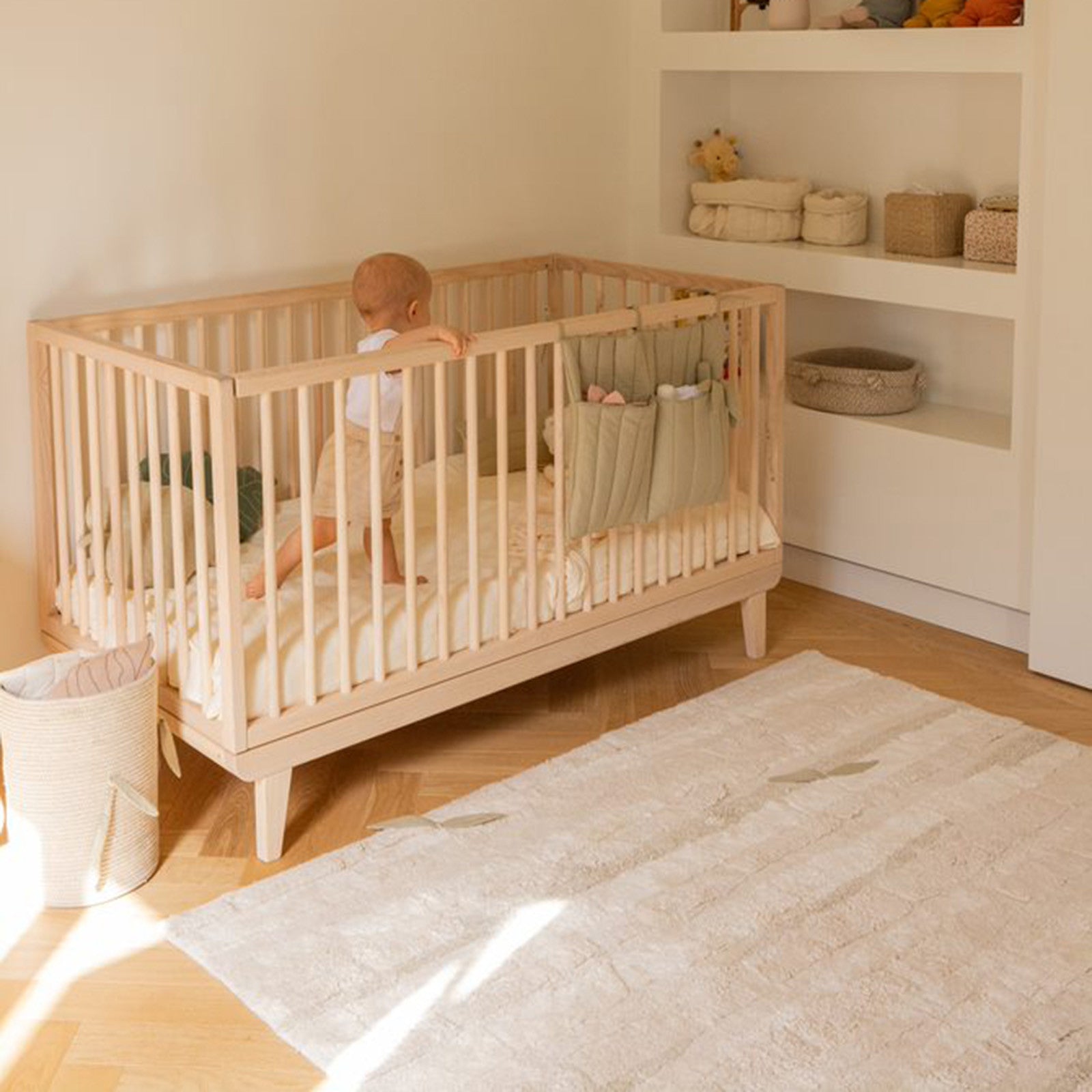 It is decorated with 5 removable bamboo leaves made from embroidered organic cotton poplin. The rug is packed in a practical, reusable cotton bag.