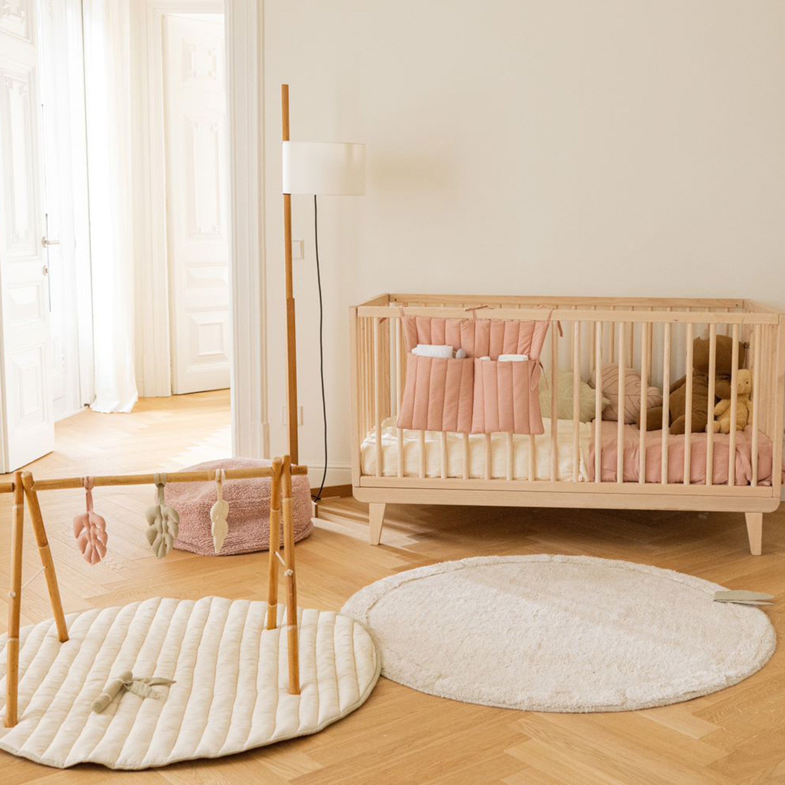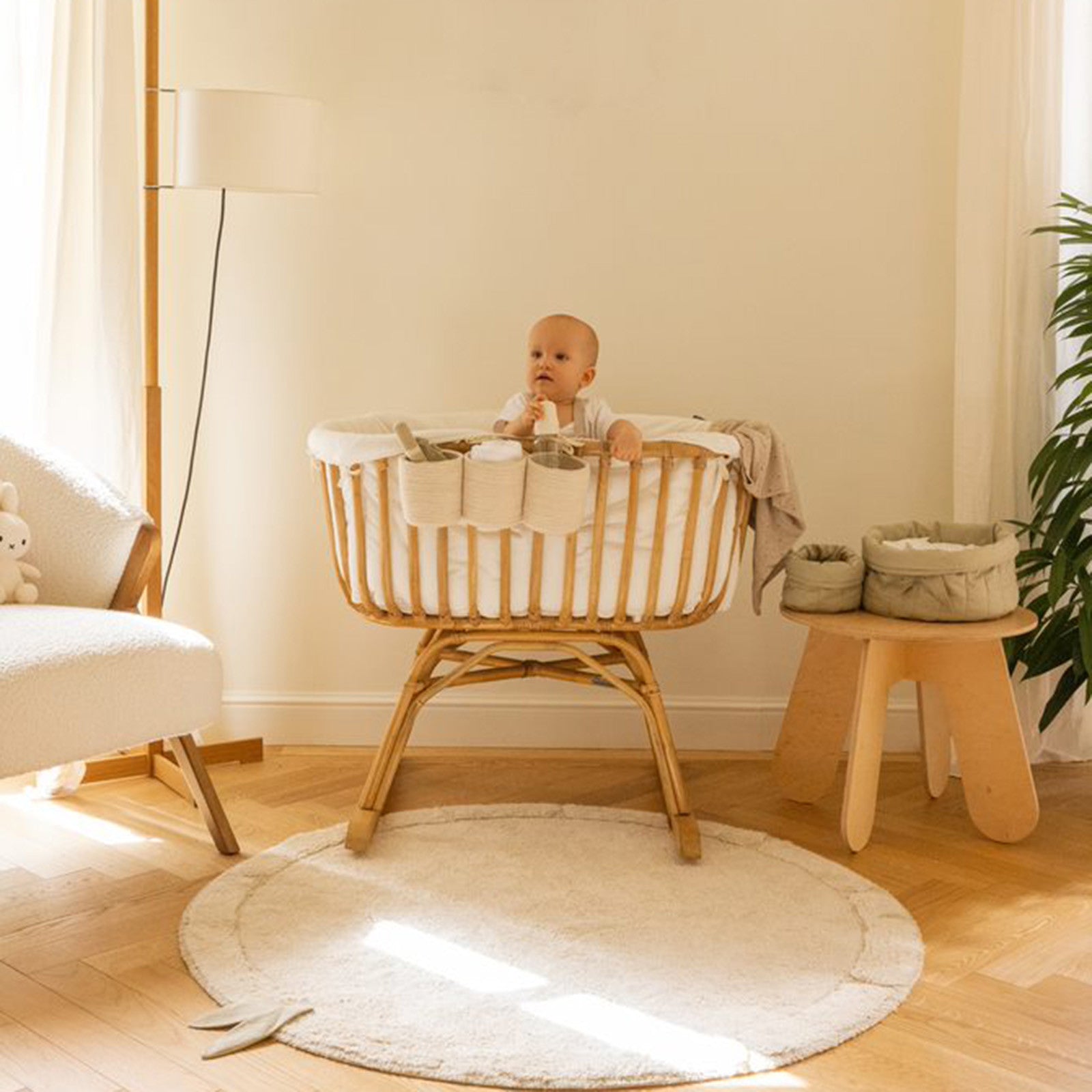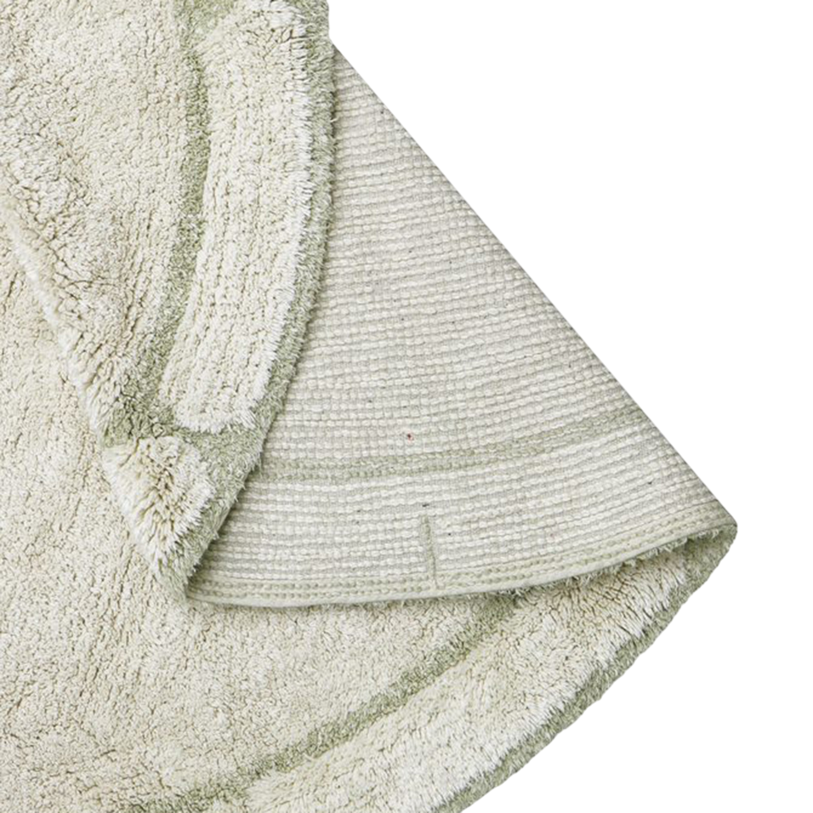 The Bamboo Leaf rug is tufted with an extra soft cotton pile mixed with bamboo rayon. A slightly higher pile forms a natural edge that simulates bamboo canes. The rug is in natural, undyed colors, with a hint of soft olive, and is embellished with an easily removable, organic cotton piece of sensory bamboo leaves in olive. Comes with a practical printed cotton bag.