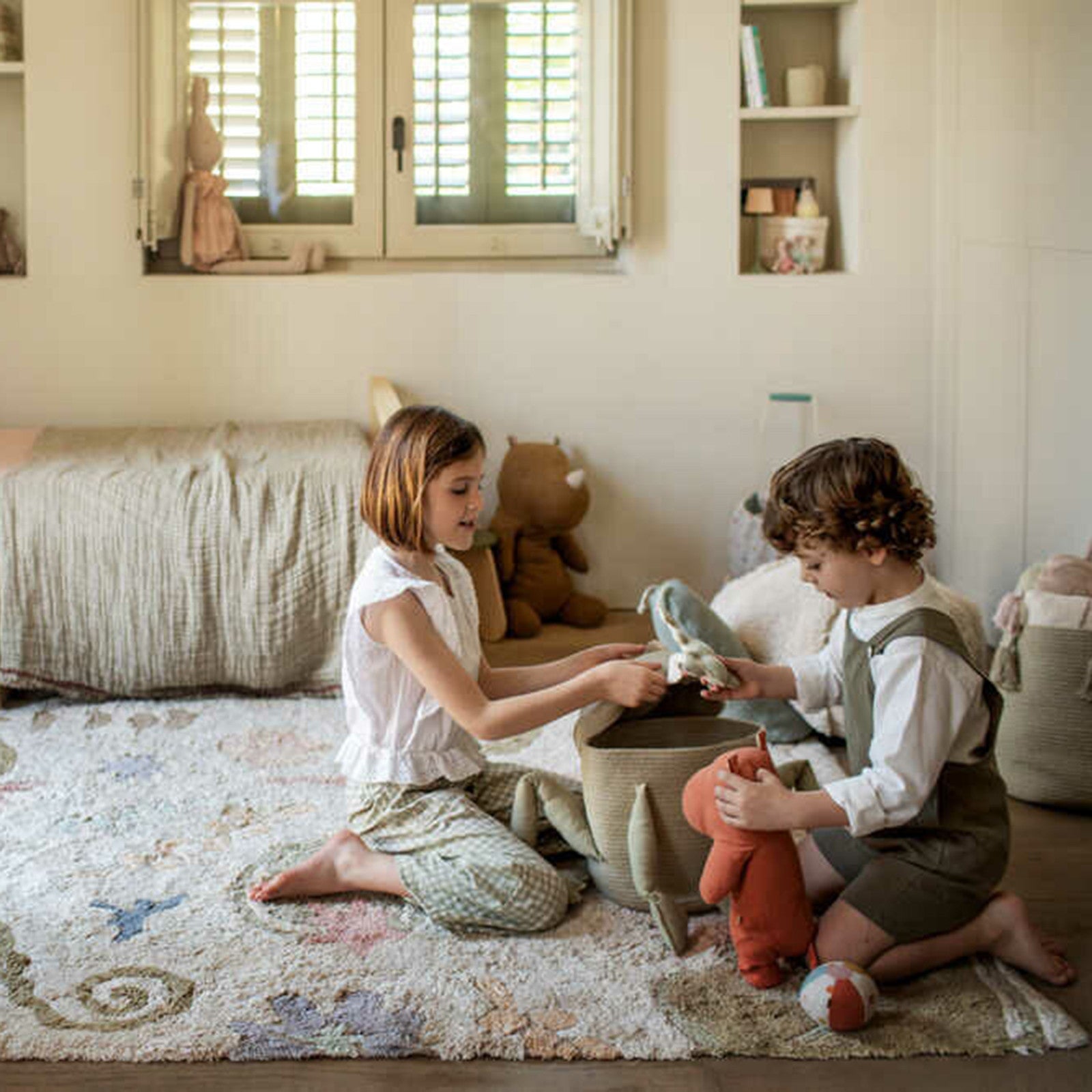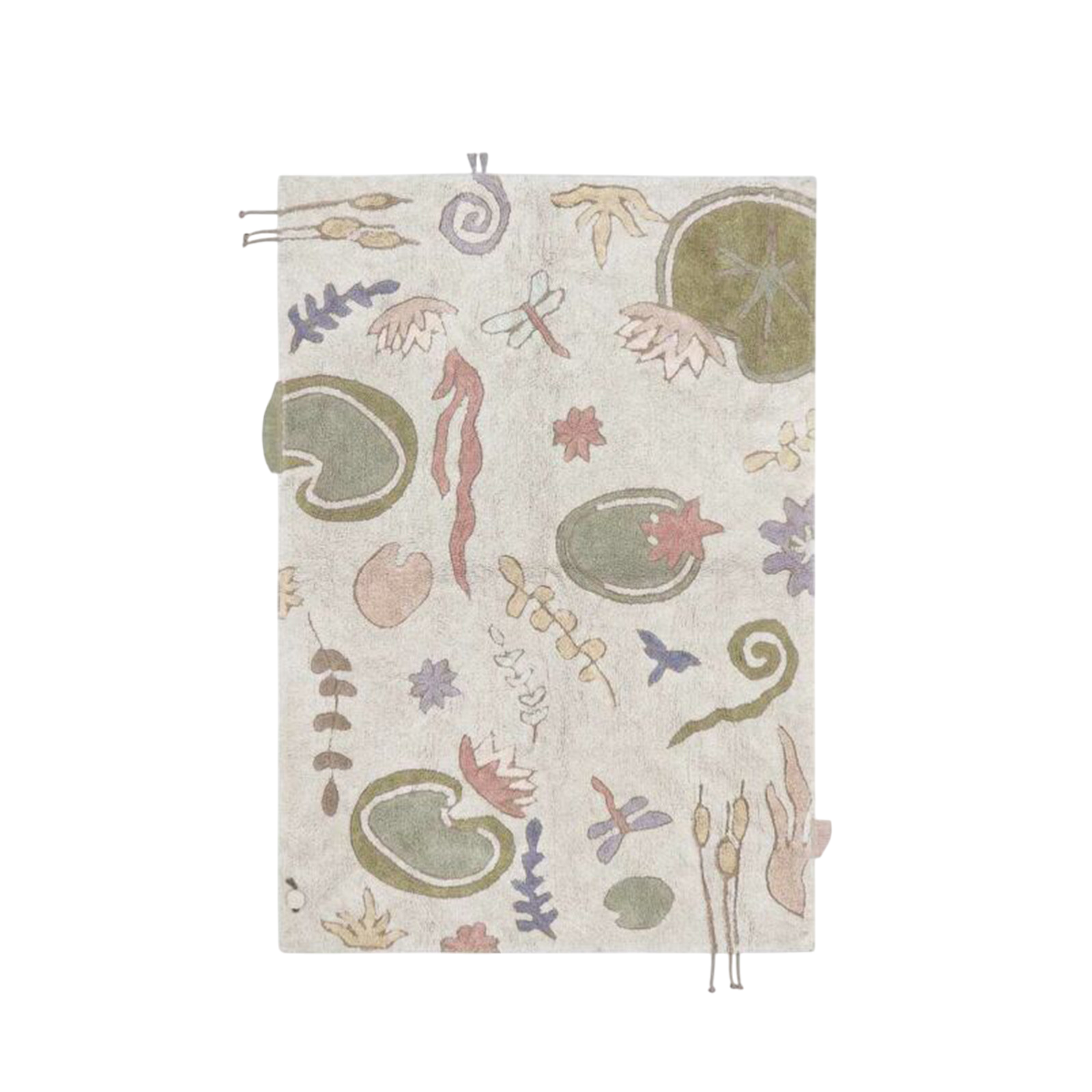 With this pastel-colored, washable cotton rug, little ones can immerse themselves in a pond fantasy world that brings a piece of nature into the home, including a pet frog and snail! Children can use them to interact with the rug and bring it to life in their imagination. Fred the frog and the lazy snail will keep them company as they play. An ideal rug for decorating a child's room with a touch of botanical fantasy.