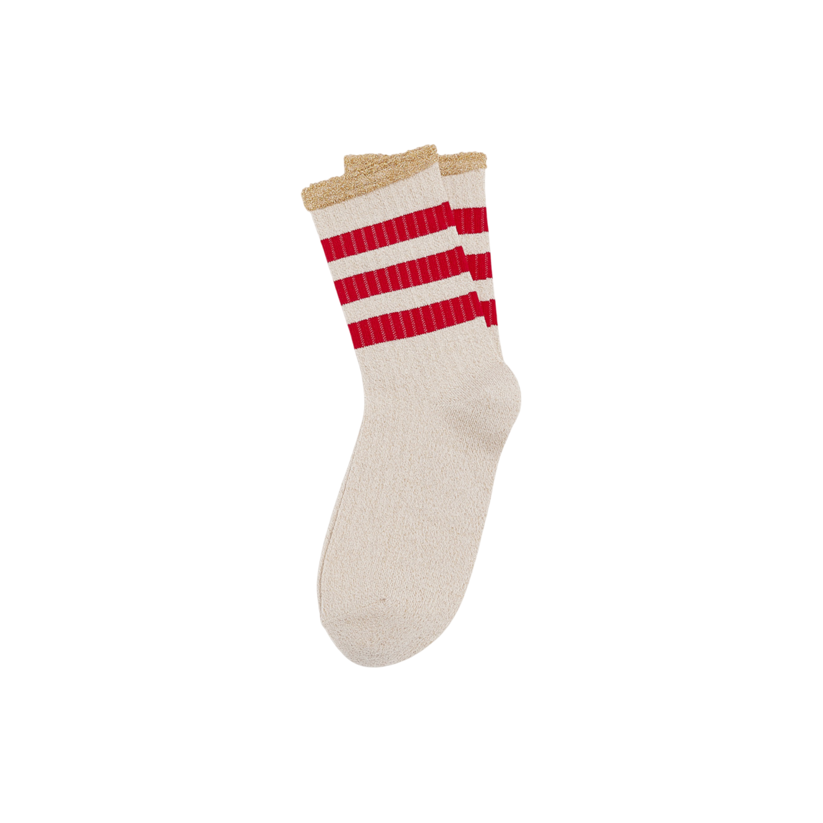 The Byor Stripe red socks not only offer comfort, but also a fresh, lively look. With their striking red stripes and warm base color, they are the perfect addition to any children's outfit. Made from a high-quality cotton blend, they are breathable, soft and particularly comfortable to wear. Whether playing, doing gymnastics at school or for special occasions - the socks are reliable and always stay in place thanks to their elasticated cuffs. Sustainably produced and designed with great attention to detail, they stand for the high quality that characterizes Bellerose. Ideal for families looking for practical yet stylish basics that are also durable. Also available with blue stripes.