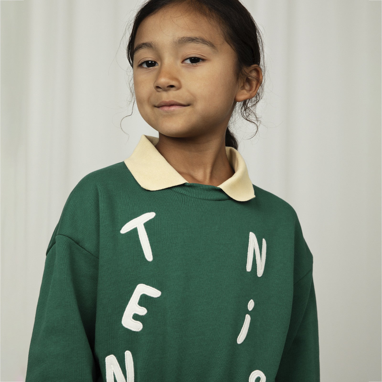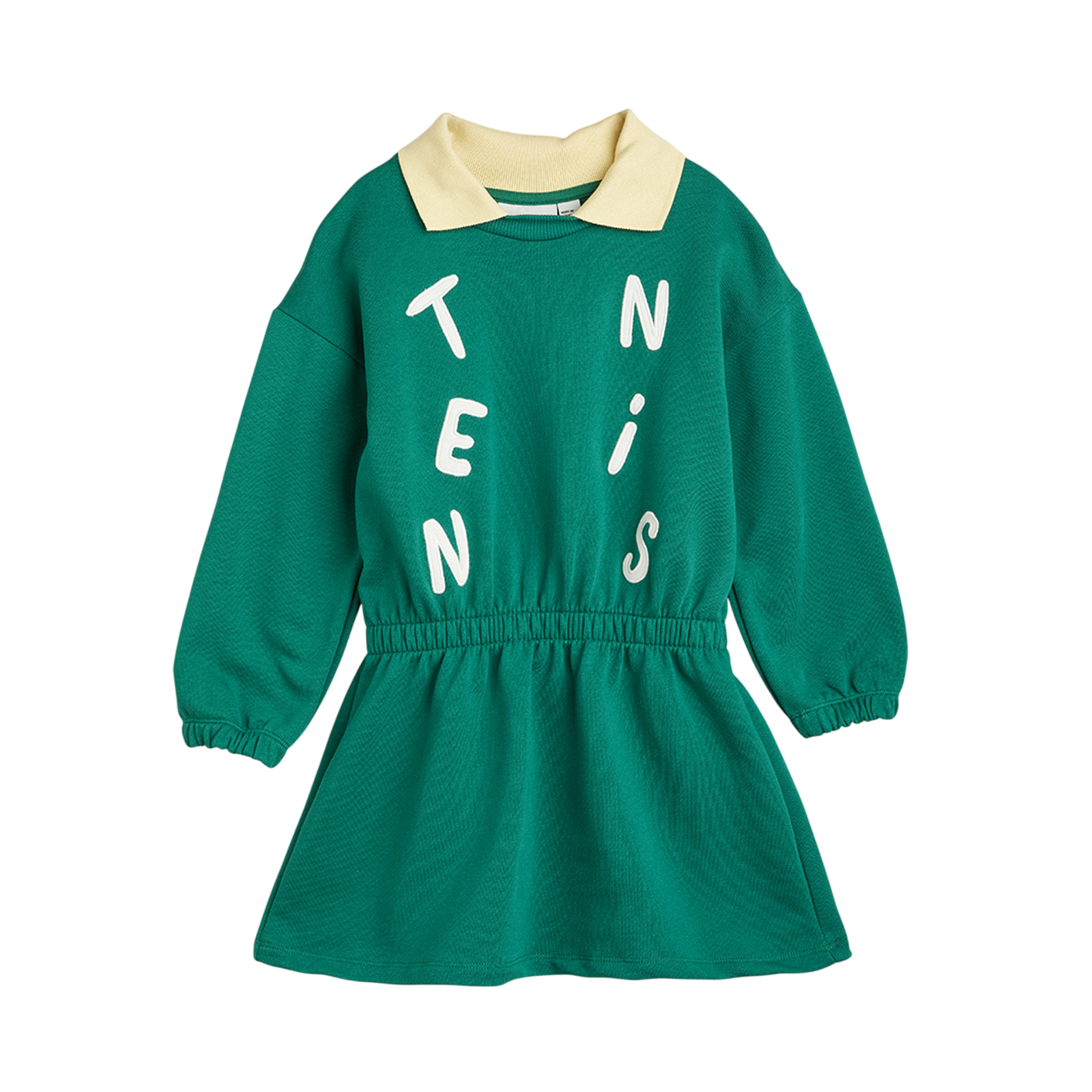 Dress made from GOTS-certified organic cotton. With dropped shoulders, contrasting collar and elasticated cuffs and waistband. Decorated with tennis appliqués.