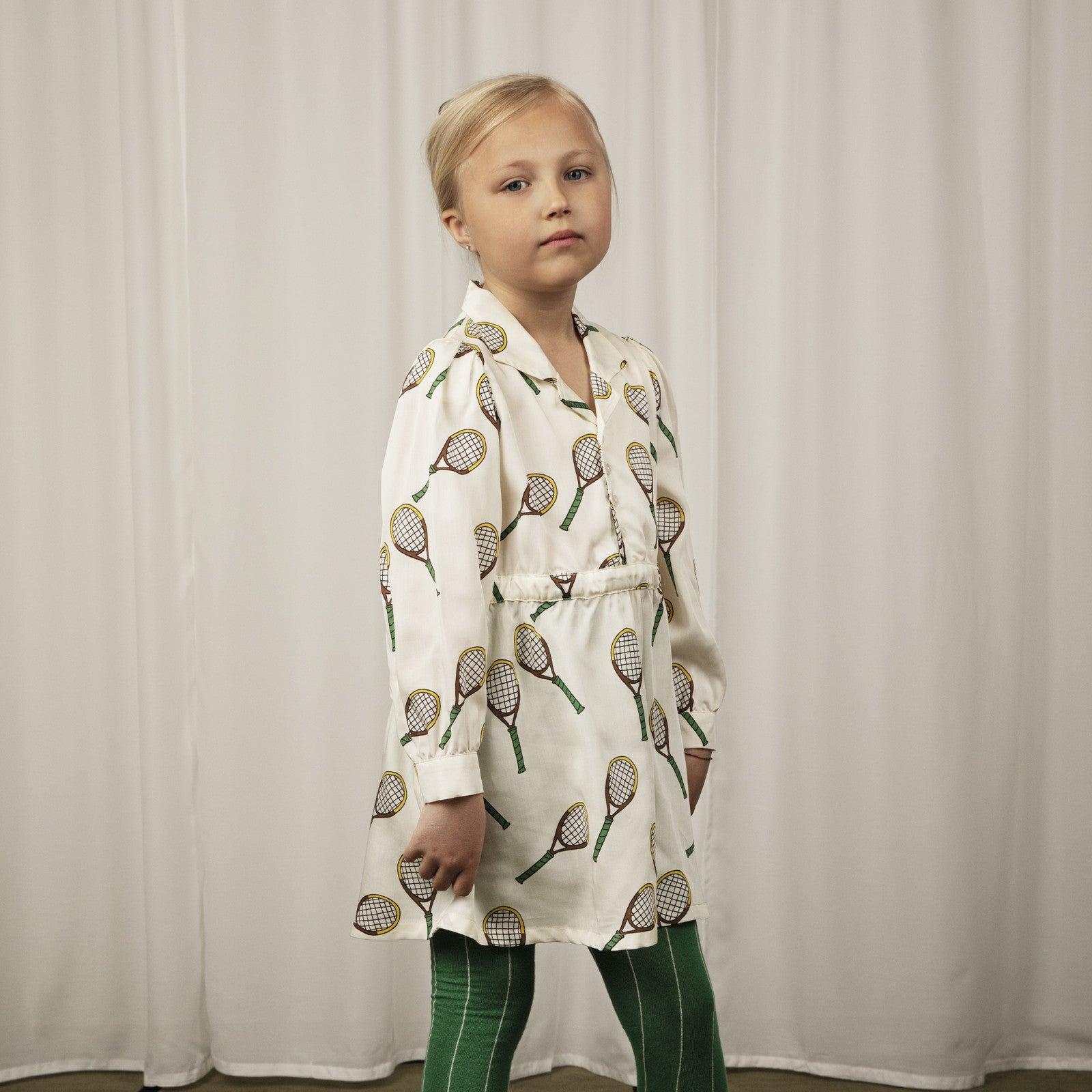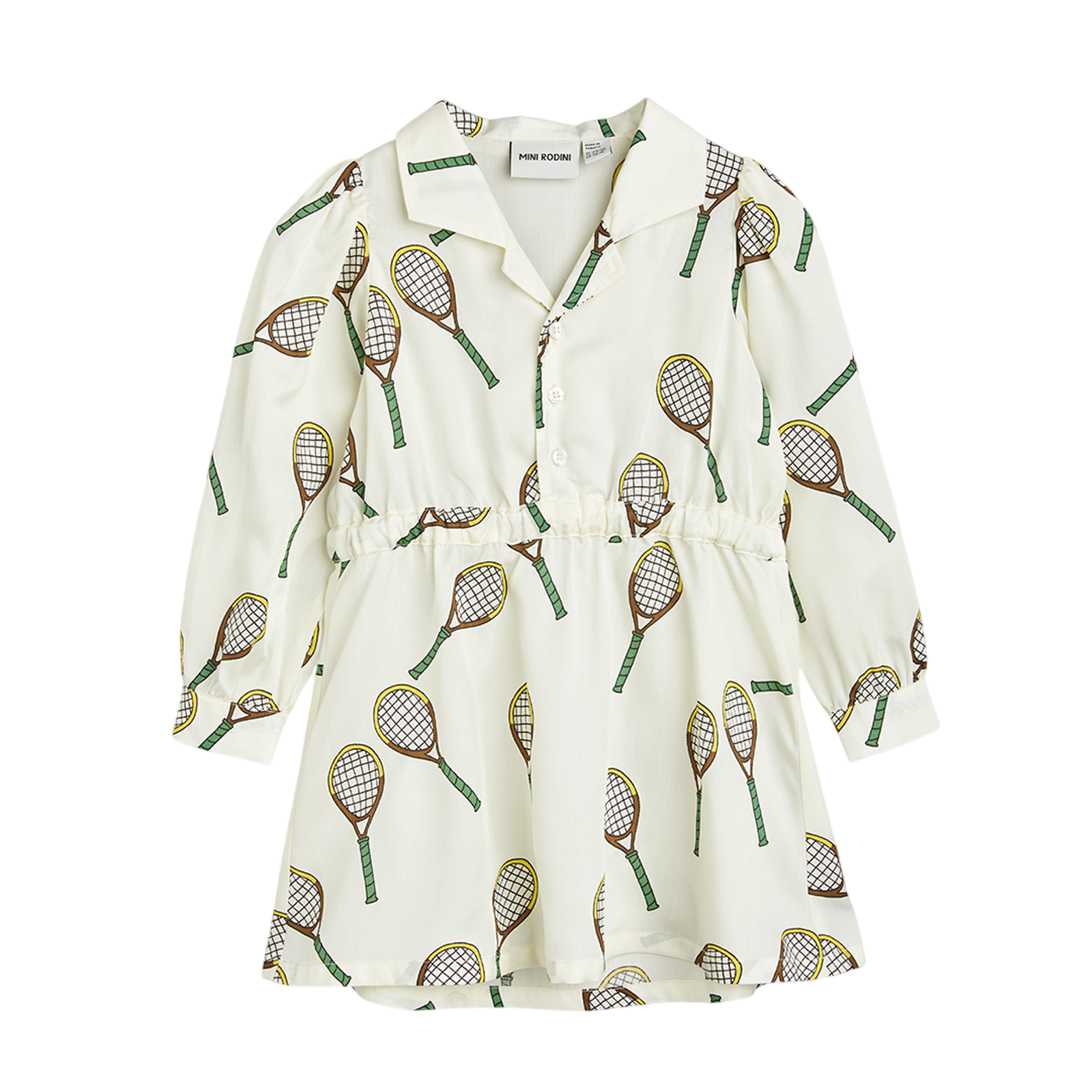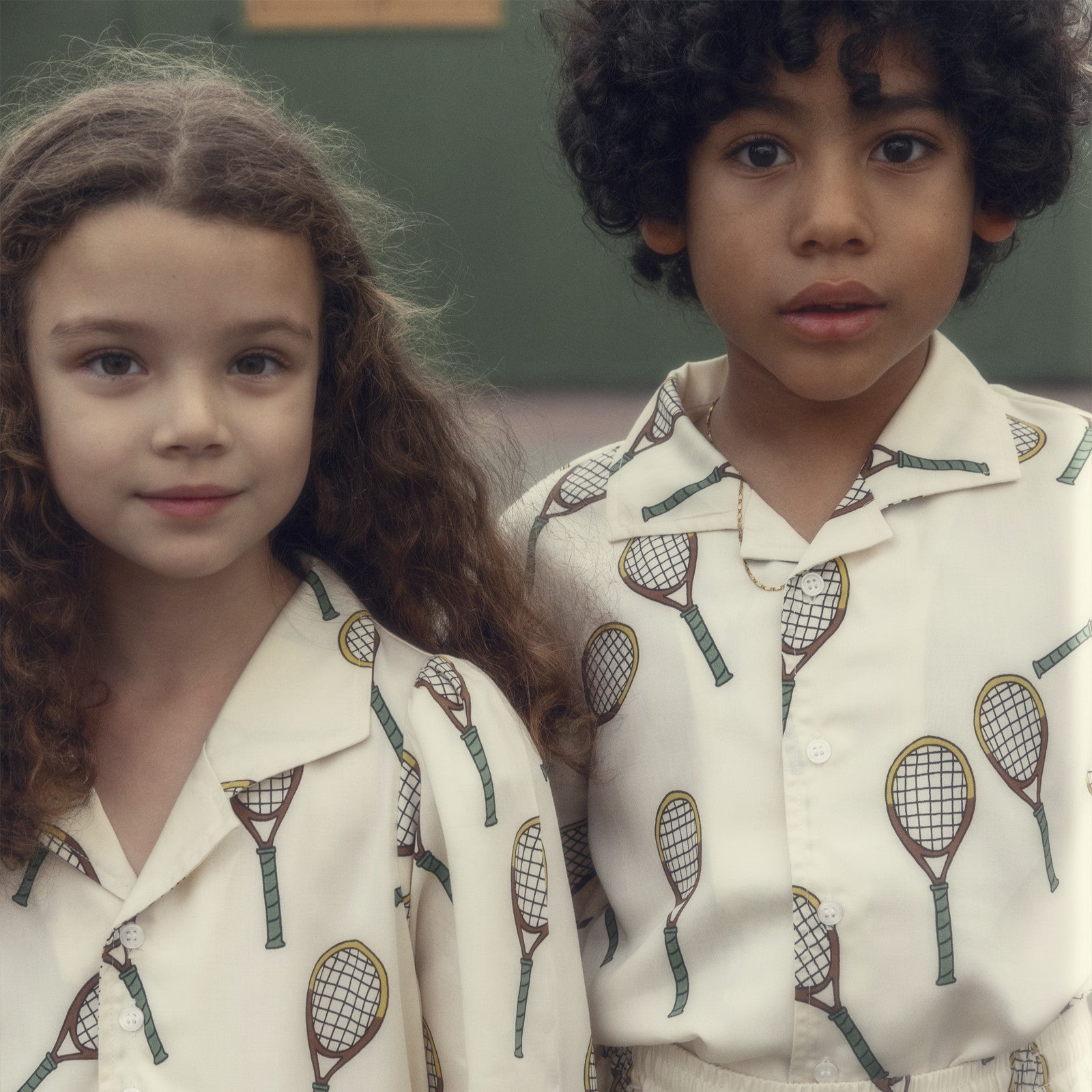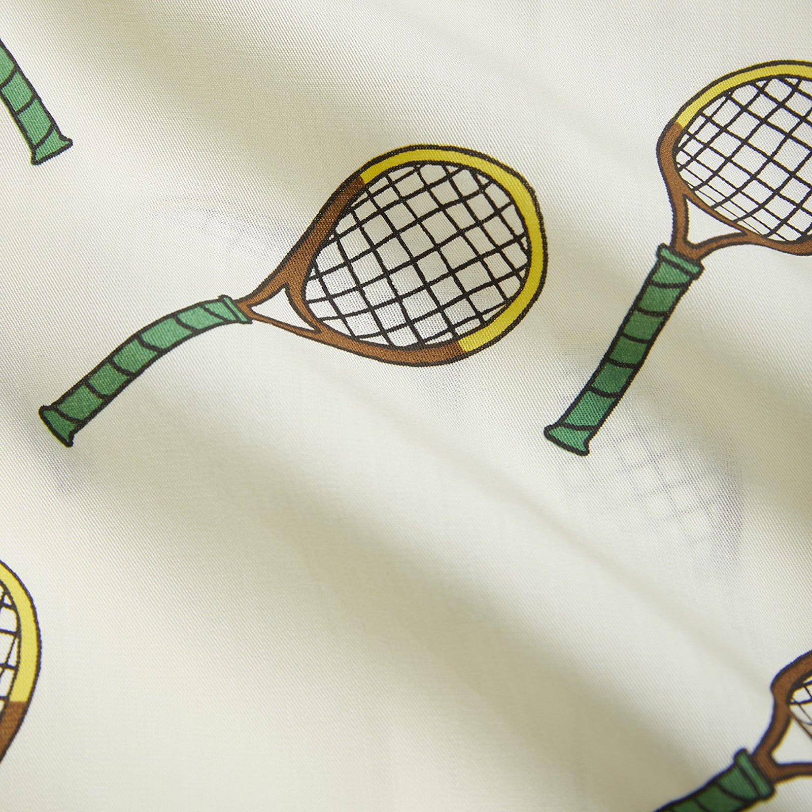 With button fastening, Cuban collar, puff sleeves and elastic waistband. Decorated with an all-over tennis print.