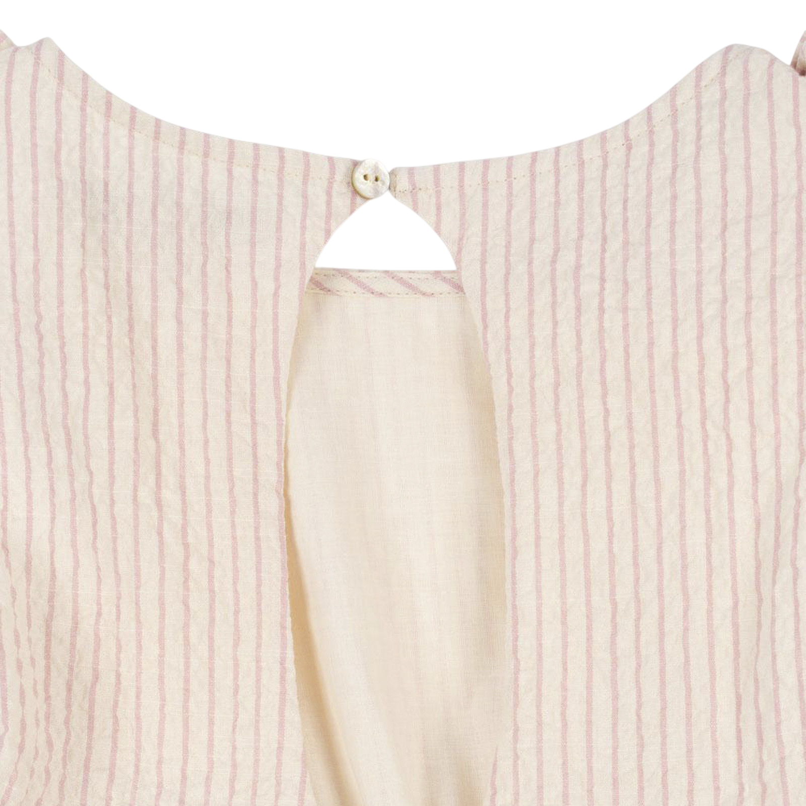 A summer full of lightness - the Ellie Peony Stripe dress by Konges Sløjd is perfect for sunny days and carefree adventures. The fine stripes in soft pink lend it a classic elegance, while the playful flounces create a dreamy silhouette. The soft organic cotton fabric feels light and comfy against the skin and allows plenty of freedom of movement for exuberant playing and dancing. Lovely details such as the delicate bows on the straps and the embroidered cherry motifs on the hem make this summer dress a real favorite. Whether for a day at the lake, a garden party or a family outing - this dress is a faithful companion for magical summer moments.