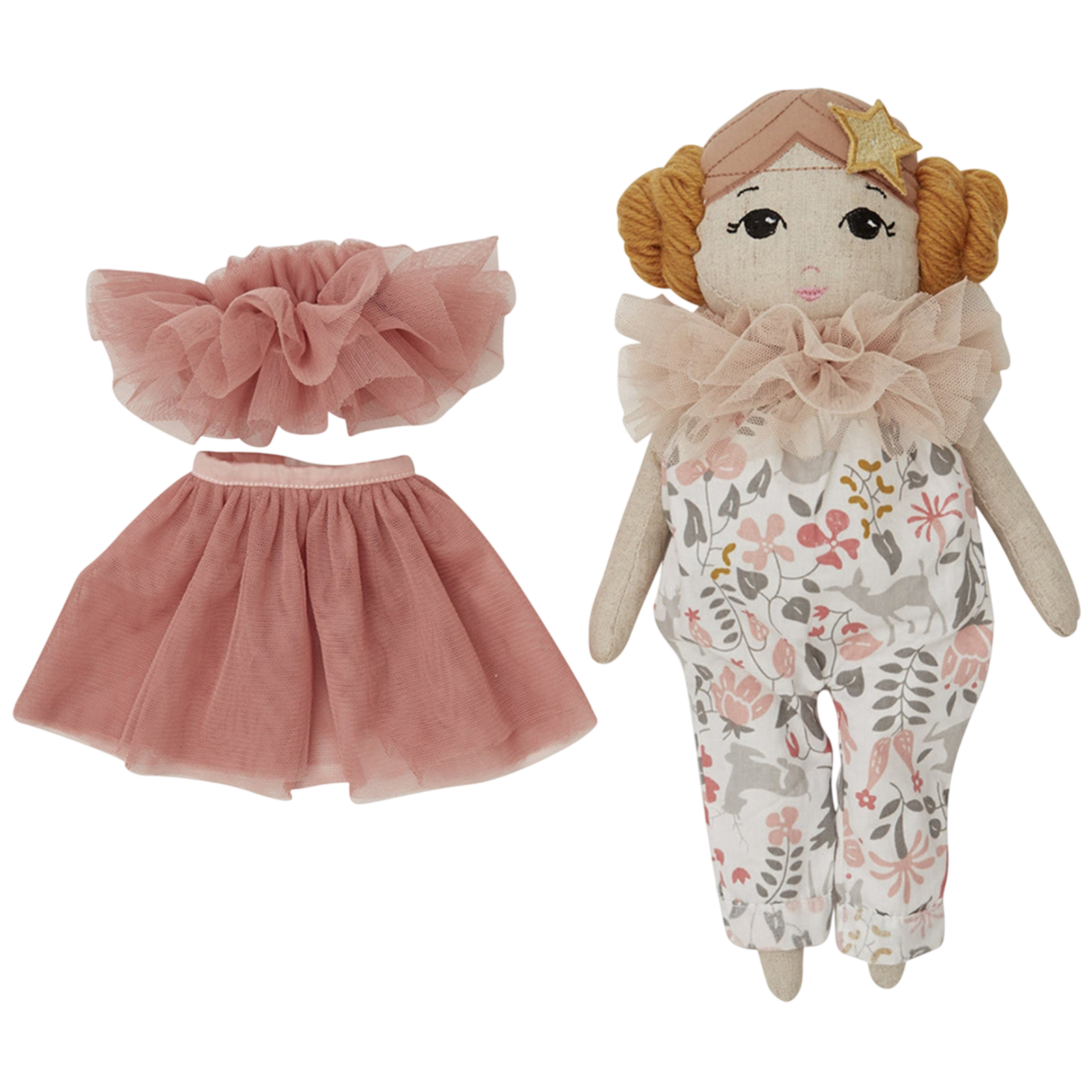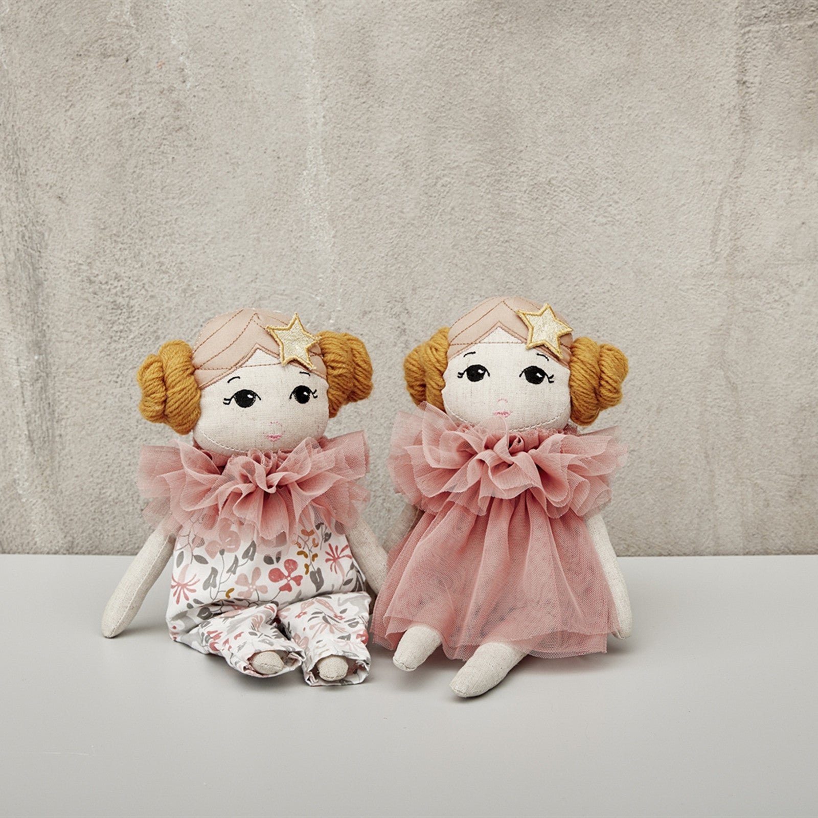 The by ASTRUP rag doll Estelle enchants with her cute outfit and elaborately embroidered details. Her elegant appearance in a tulle dress not only makes her perfect for imaginative role play and doll adventures, but also makes her a very special gift. Children can imagine Estelle taking part in balls or traveling through magical worlds. Her soft materials make her ideal for cuddling and loving. In addition to the tulle dress, Estelle also comes with a chic trouser suit that can be changed. Incidentally, she also has a charming sister Fleur, also from by ASTRUP.