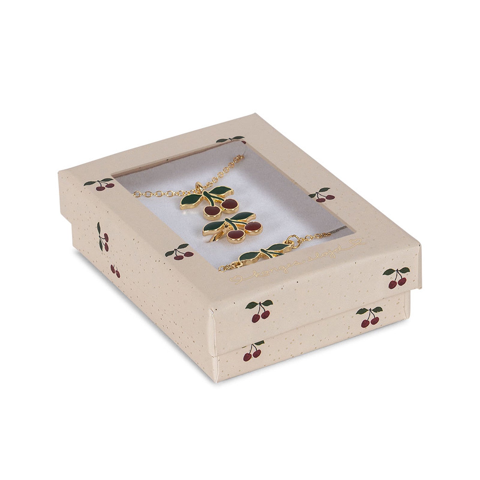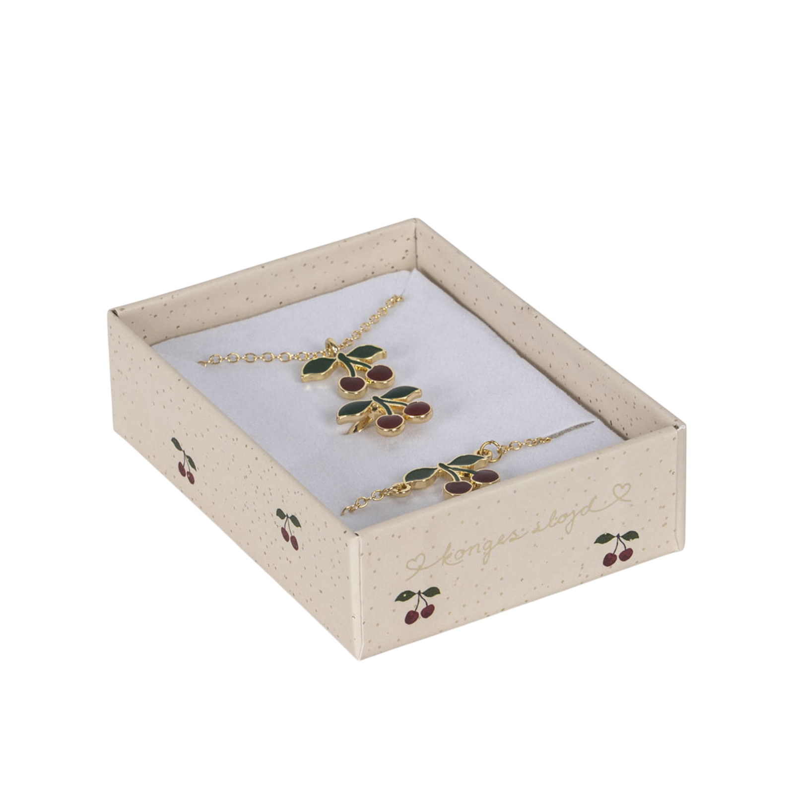 This enchanting jewelry set from Konges Sløjd is perfect for any child. With the cherry motif, it adds a touch of elegance and playfulness. Ideal as a gift or for special occasions.