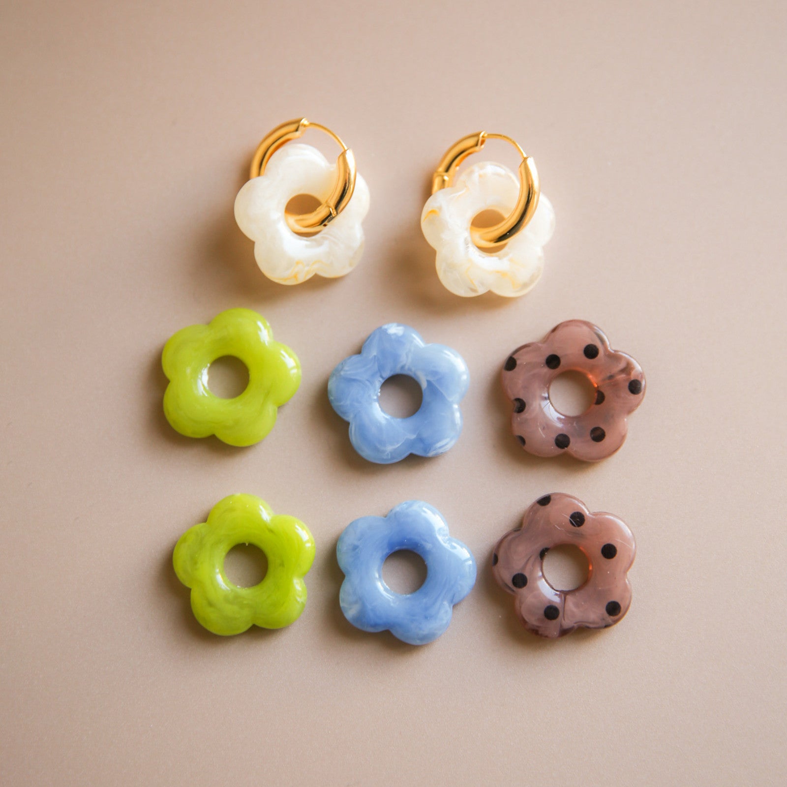 These beautiful earrings are made with acrylic flowers. The clasps are made of brass. The ear studs are handmade by Claudia Nabholz in her studio. Each piece is therefore unique and may differ slightly from the picture. This set includes a pair of hoops and 4 pairs of flowers (rose, green, blue, pink). So you can swap and combine as the mood takes you.