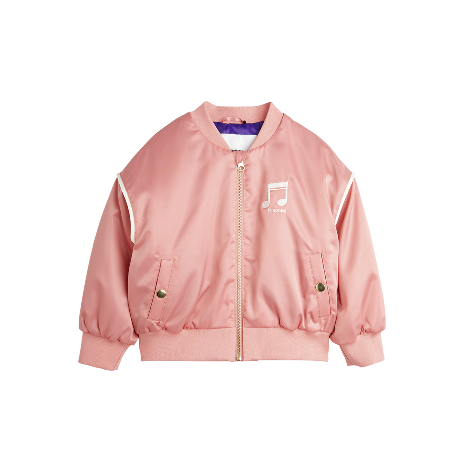 The Note Chenille Satin Pink jacket from Mini Rodini combines comfort and style in a sophisticated design. Made from soft chenille satin, the jacket feels pleasant against the skin and creates a sophisticated look. The embroidered music note motif on the chest adds a creative and playful touch, while the elasticated cuffs and practical zipper ensure an optimal fit and ease of use. Two side pockets provide space for small treasures, while the lightweight lining ensures cozy warmth on cooler days. This children's bomber jacket can be perfectly combined with the Note White pants or a plain T-shirt from the Mini Rodini collection to create a harmonious outfit. Whether for everyday wear, family outings or special occasions - this sustainably produced jacket is a perfect choice for all occasions and a must-have for little music lovers.