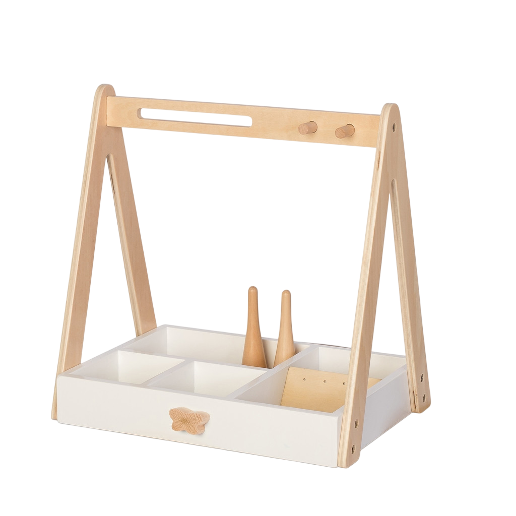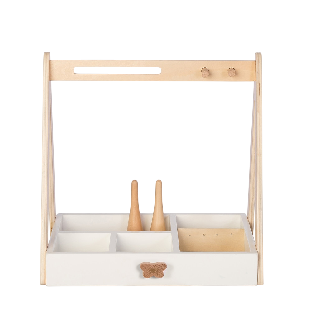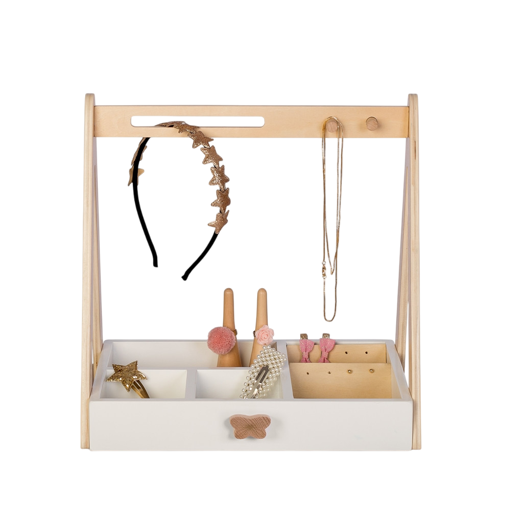 The wooden jewelry stand is a cute accessory for the children's room. Children can store their jewelry or hair accessories here in style. With its simple design and wooden details, the stand fits perfectly into any child's room and is also a great way to keep things tidy. The small compartments and hooks offer enough space for necklaces, bracelets and more. A functional and decorative element that playfully encourages children's sense of responsibility by keeping their treasures neat and tidy. This jewelry stand is not only practical, but also a beautiful decorative object for little girls or boys.