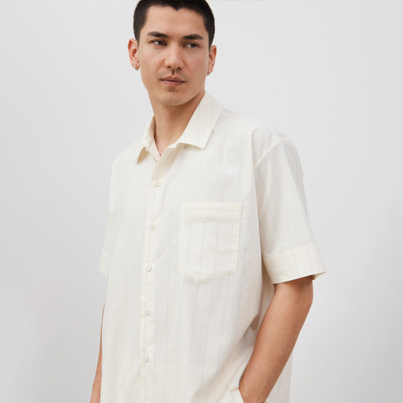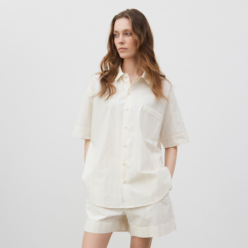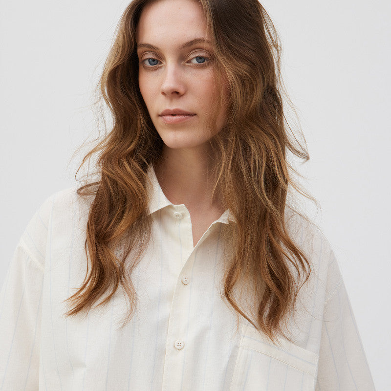 The John short-sleeved shirt in Sky by Lavie stands for lightness and unagitated clarity. The light, creamy shade looks like sunlight on a fresh canvas, while the delicate vertical stripes lend the design a subtle calm. The classic shirt collar and short sleeves make John a versatile companion - whether worn solo on warm days or as a layer under a knit or blazer. Made from soft organic cotton and manufactured with great care in Europe, the shirt combines conscious design with a high level of comfort. With John, Lavie shows that everyday beauty can be very quiet - and still make an impact. For everyone who feels at home with clean lines, natural materials and subtle tones.