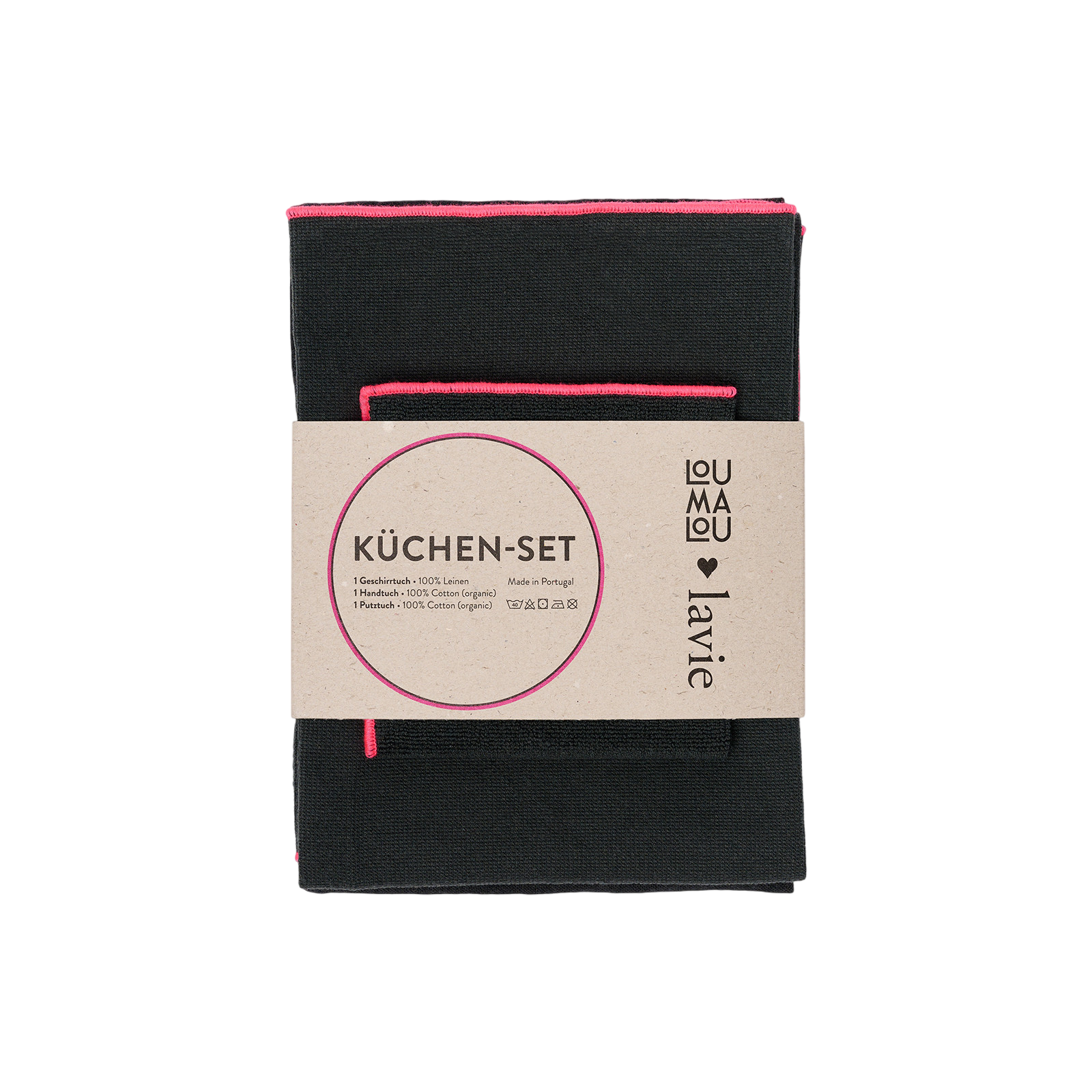 All three things are good: the Mara kitchen set, designed by Nadja Zimmermann alias LouMalou, made from high-quality natural fibers, contains a linen tea towel, a kitchen towel and a cleaning cloth made from organic cotton. How nice when everything fits together harmoniously! The three-pack is also available in the color undyed with neon yellow contrast stitching as the Ella kitchen set.
