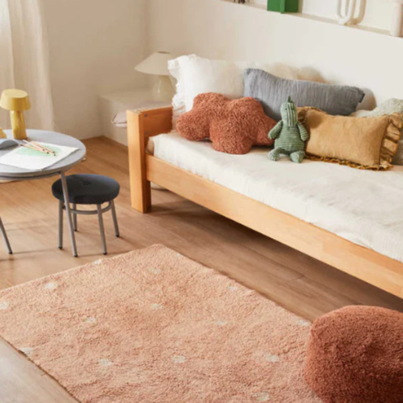 A soft, plush cotton rug with a dot pattern that never goes out of style. The Mini Dot rug is tufted from extra dense, soft cotton pile and is available in three color combinations: Chestnut with natural dots, Rose with natural dots and Blue Sage with natural dots.