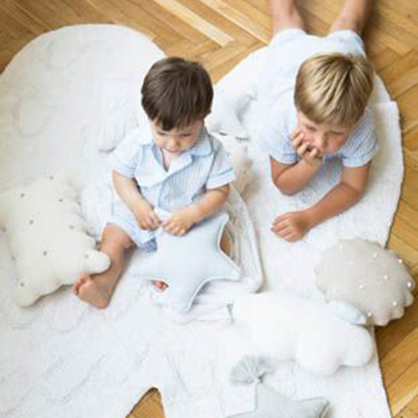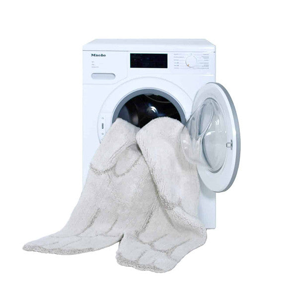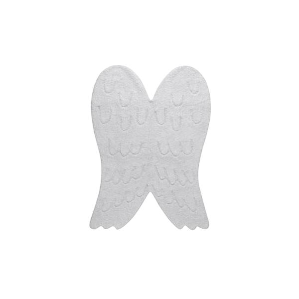 A soft, washable mini rug in the shape of a pair of wings, with a soft ivory cotton pile and delicate design details in linen and pearl gray. Comes with a handy drawstring bag.