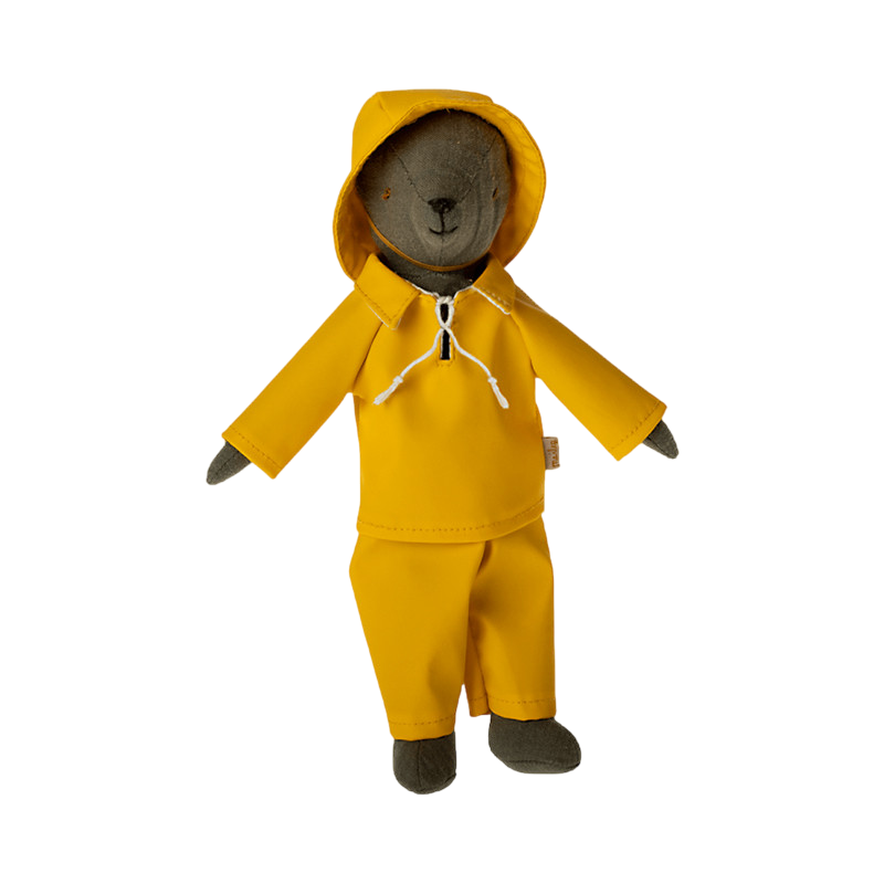 Teddy Dad is ready for any weather! In his bright yellow Maileg rain suit, he is ready to dance through the rain with the children. Whether he's looking for earthworms or a big puddle jump - with this outfit, he's well equipped for all adventures.