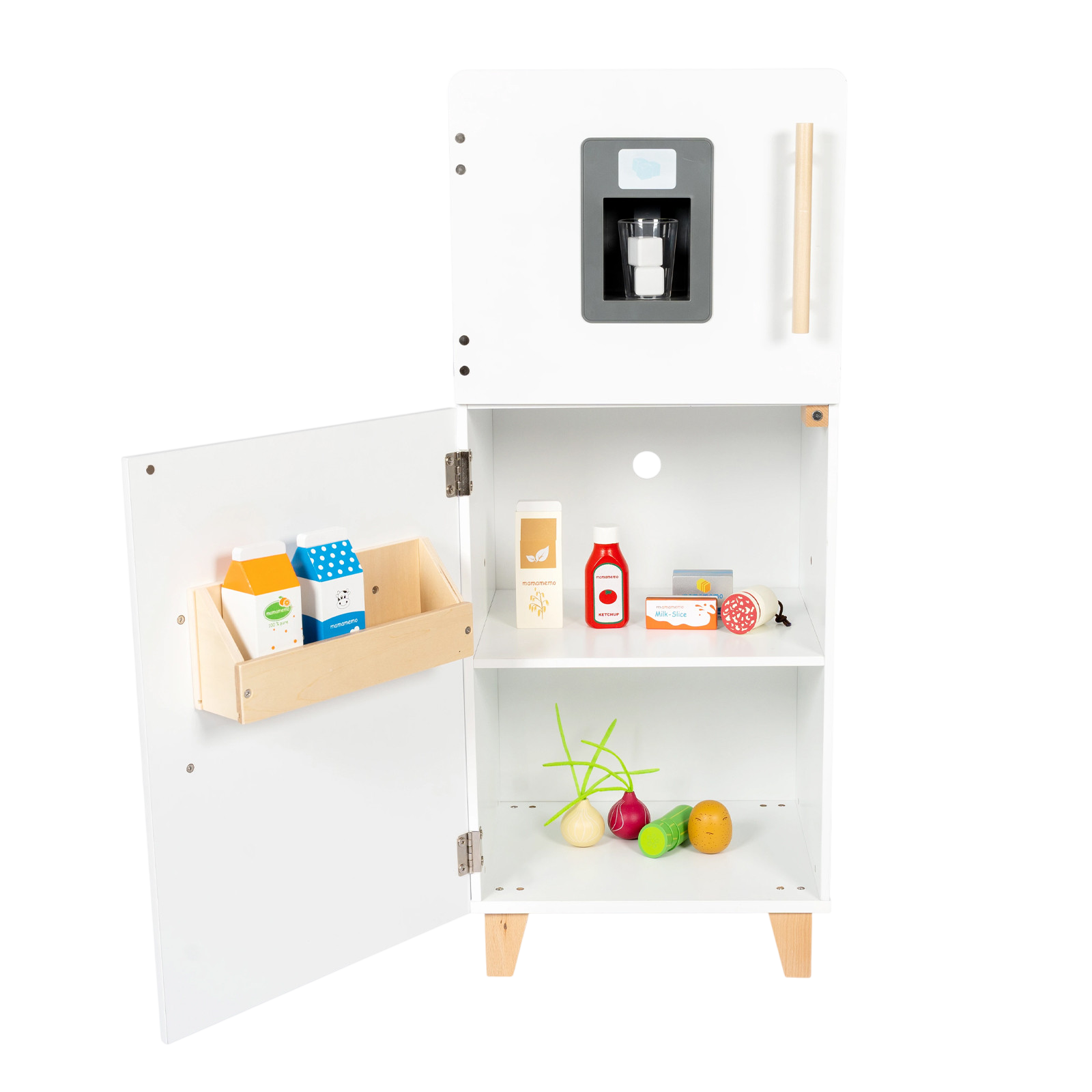 The Mamamemo fridge combines modern design and imaginative play options. With an integrated ice cube dispenser, spacious compartments and authentic wooden details, every game in the children's kitchen becomes an adventure. Children can store and organize food and playfully recreate everyday life. The high-quality design not only ensures a realistic play experience, but also provides an aesthetic addition to the children's room. Whether milk, vegetables or ice cream - everything has its place. The role play encourages creativity and social interaction while teaching practical knowledge. This fridge is a durable and educational toy for children aged 3 and over.