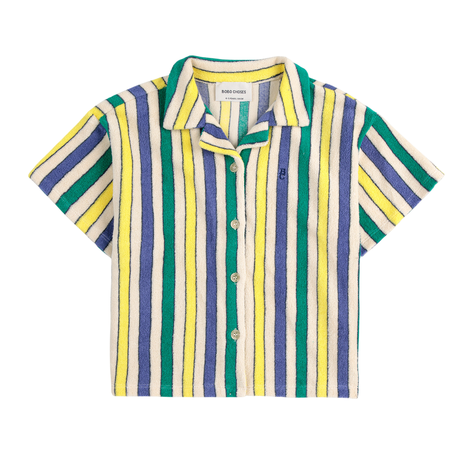The Multicolor Stripes Terry Offwhite short-sleeved shirt from Bobo Choses is a cheerful companion for summer adventures. The vibrant stripes in fresh colors are reminiscent of sunny days by the sea and add a touch of light-heartedness to any outfit. Made from soft terry cloth, it ensures optimum comfort - whether you're playing, walking or relaxing. The classic polo collar gives the shirt an elegant touch, while the sustainable manufacturing process leaves a good feeling. This shirt for children can be perfectly combined with shorts or jeans and is suitable for both the playground and special occasions. Get this sustainable favourite for a colorful wardrobe.