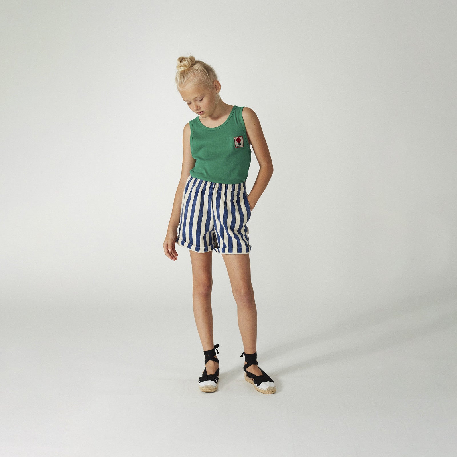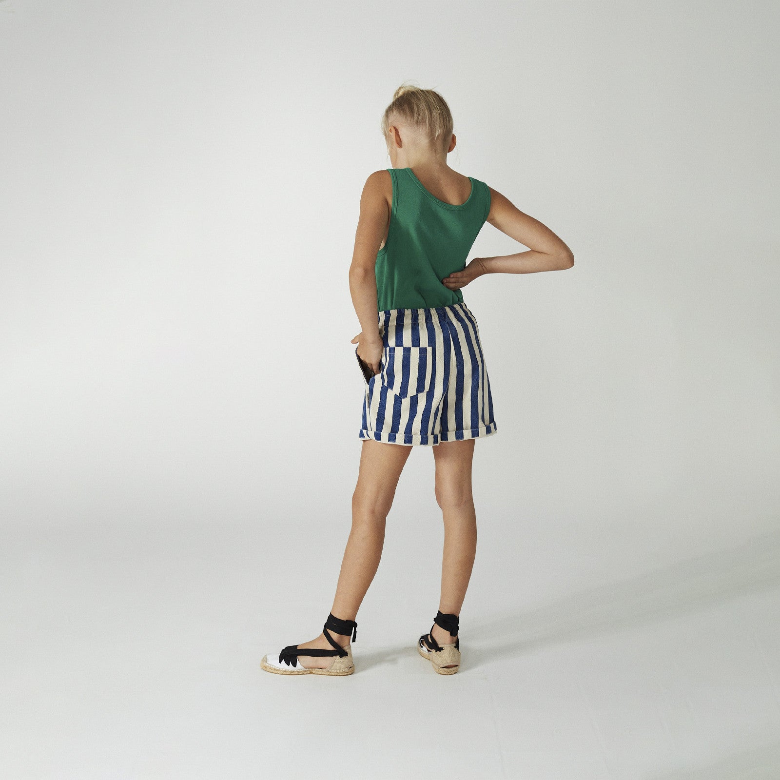 The Blue Stripes Bermuda shorts from Weekend House Kids are a summer must-have for children who love comfort and adventure. The wide stripes in blue and white evoke memories of maritime landscapes and inspire dreams of relaxed days by the sea. Made from soft, sustainable organic cotton, the shorts offer lightweight, breathable quality and maximum freedom of movement - ideal for active hours outdoors or relaxing moments at home. The elasticated waistband ensures a comfortable fit for any activity. Combined with a simple top such as the Flower Time T-shirt or a light blouse, they create versatile looks for warm summer days. These shorts combine functionality, style and sustainability and are an essential summer companion.