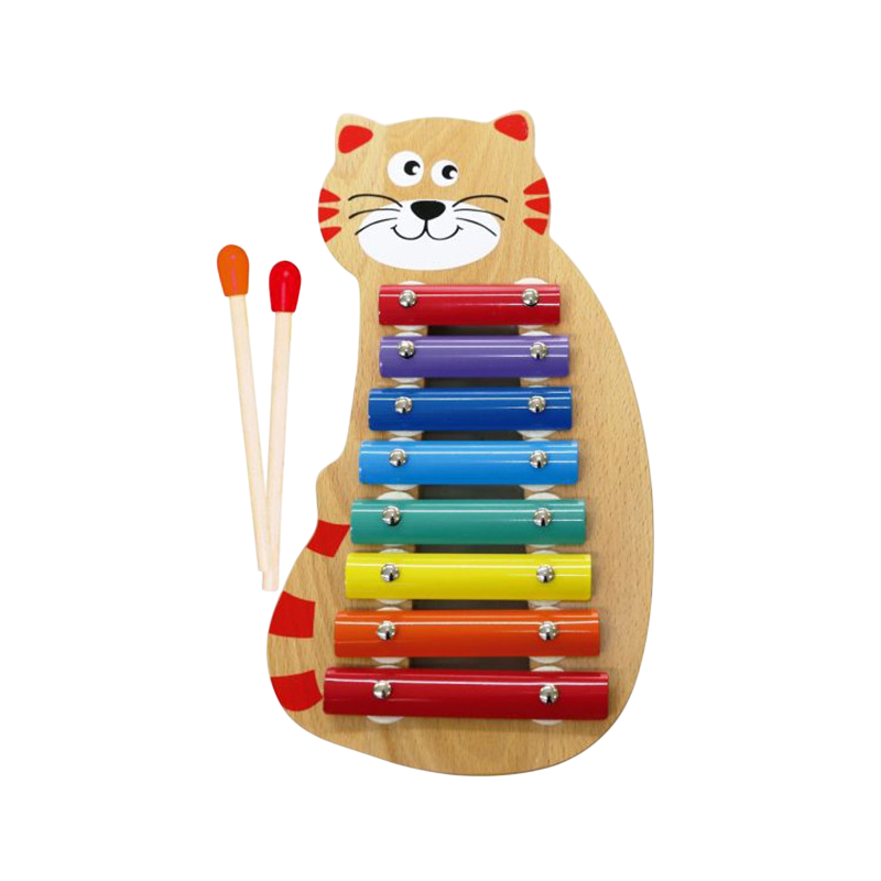 Cute xylophone in cat design with metal plates. Plays 8 different sounds. 2 drum pieces are included.