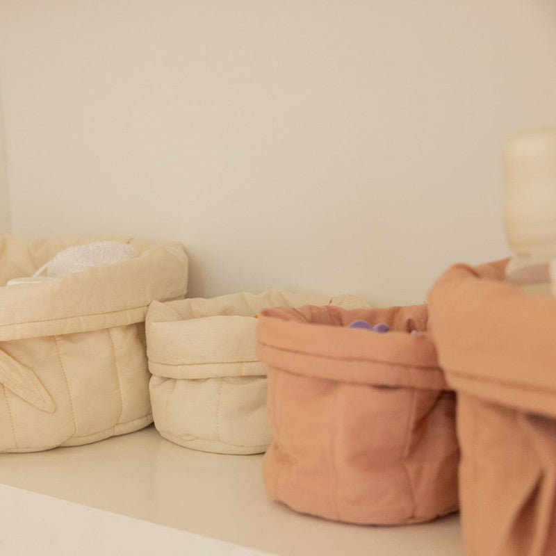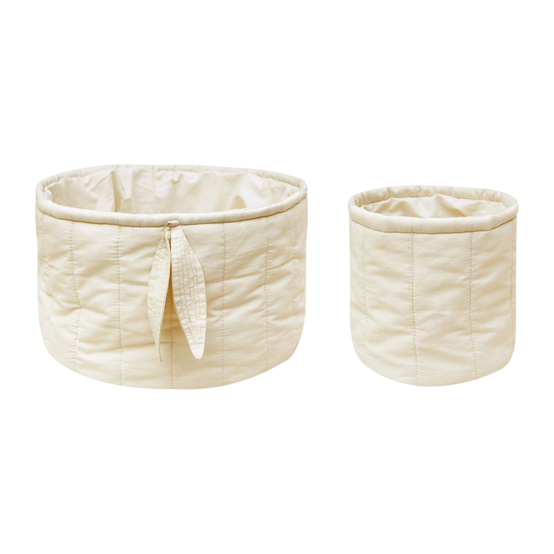 This practical set of two soft baskets made of organic cotton poplin is ideal for keeping your baby items within easy reach. Available in three different colors, the baskets are softly quilted with GRS-certified polyester filling. The large basket is decorated with a bamboo leaf in a matching color.