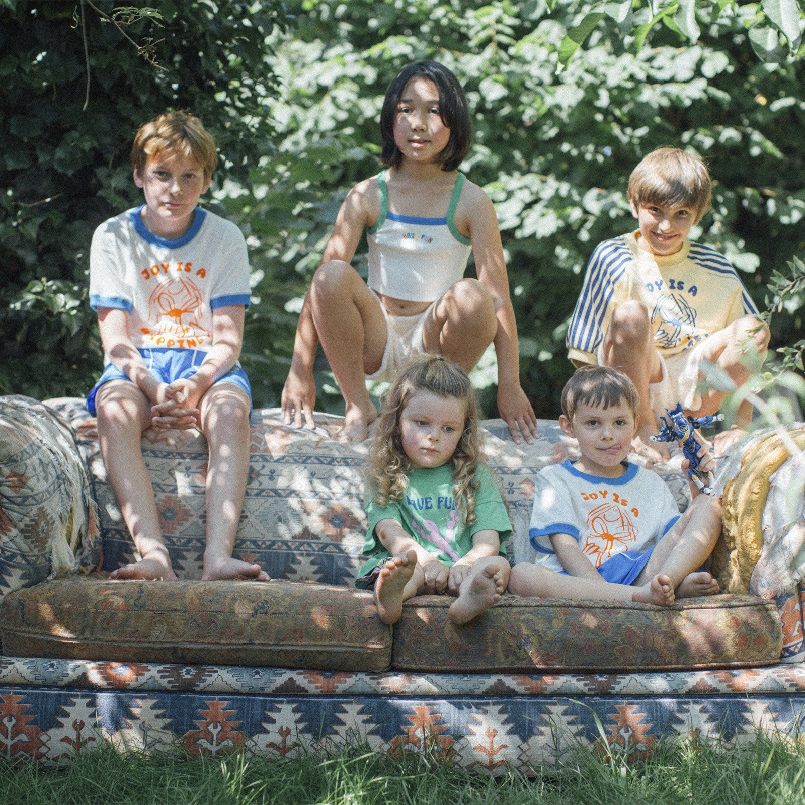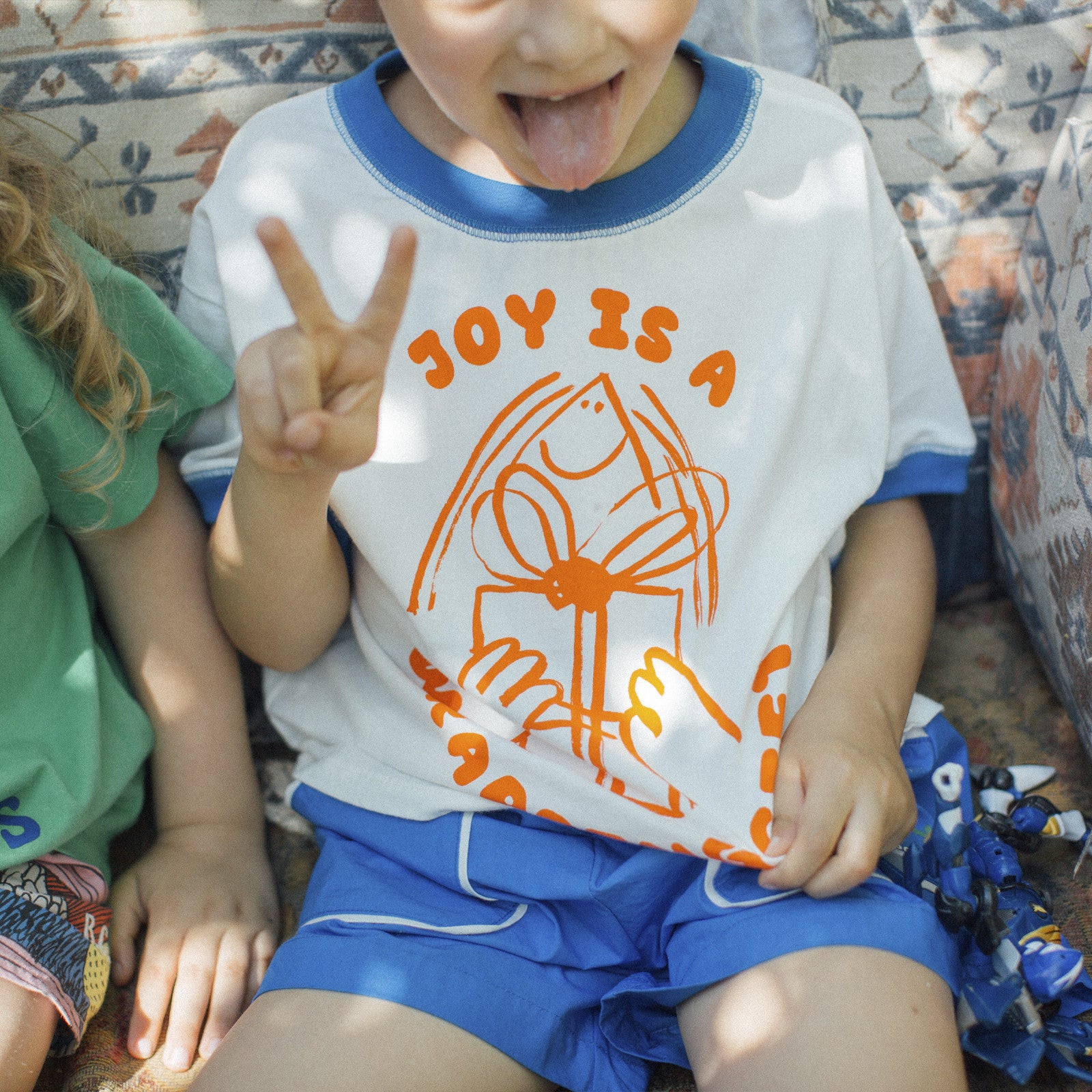 The Joy Is A Wrapping Gift Offwhite T-shirt from Bobo Choses has a cheerful message. The bright orange print on the creamy white fabric gives the children's short-sleeved shirt a fresh, playful look. The contrasting blue hem and cuffs add a sporty accent that rounds off the design perfectly. Made from soft, breathable cotton, it is extremely comfortable to wear all day long. Ideal for leisure activities or relaxed days, this top will add both style and sustainability to your child's wardrobe.