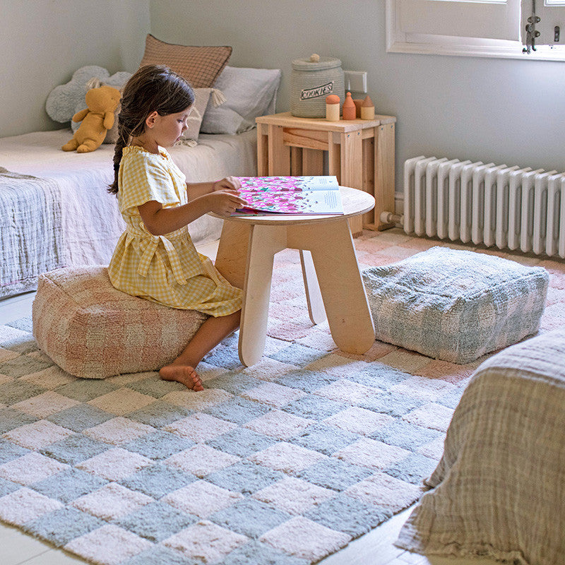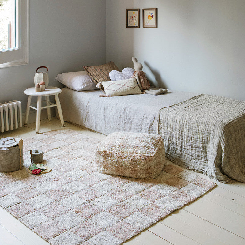 Inspired by vintage ceramic floors, the washable Kitchen Tiles rug from Lorena Canals features a checkerboard pattern that plays with a soft contrast of natural and pink tones. Lorena Canals' RugCycled Mix / Natural Canvas base fabric was used for the rug, with the base fabric remaining slightly visible between the colored squares that simulate the kitchen tiles.