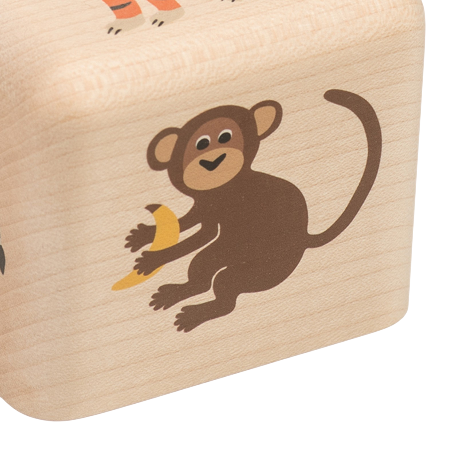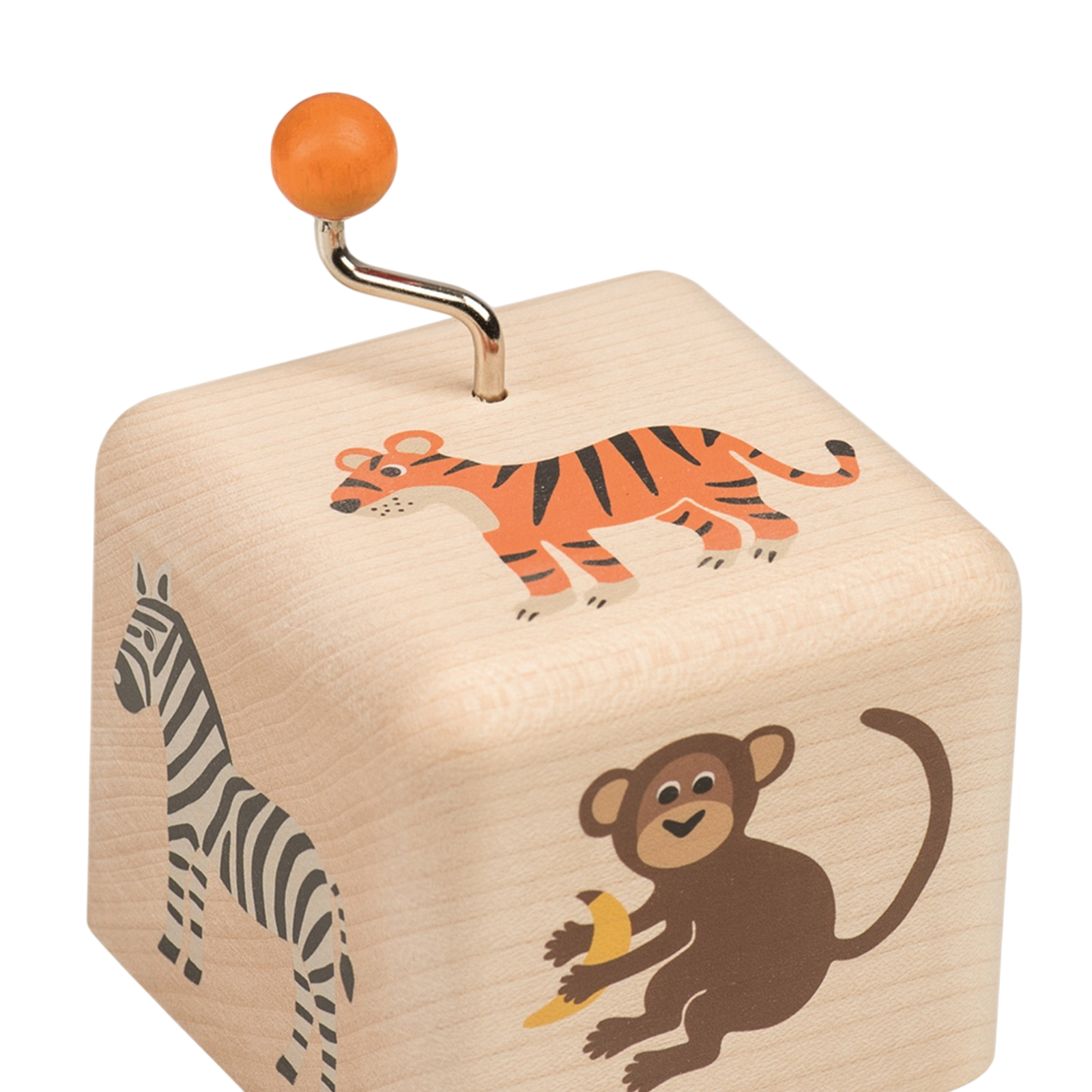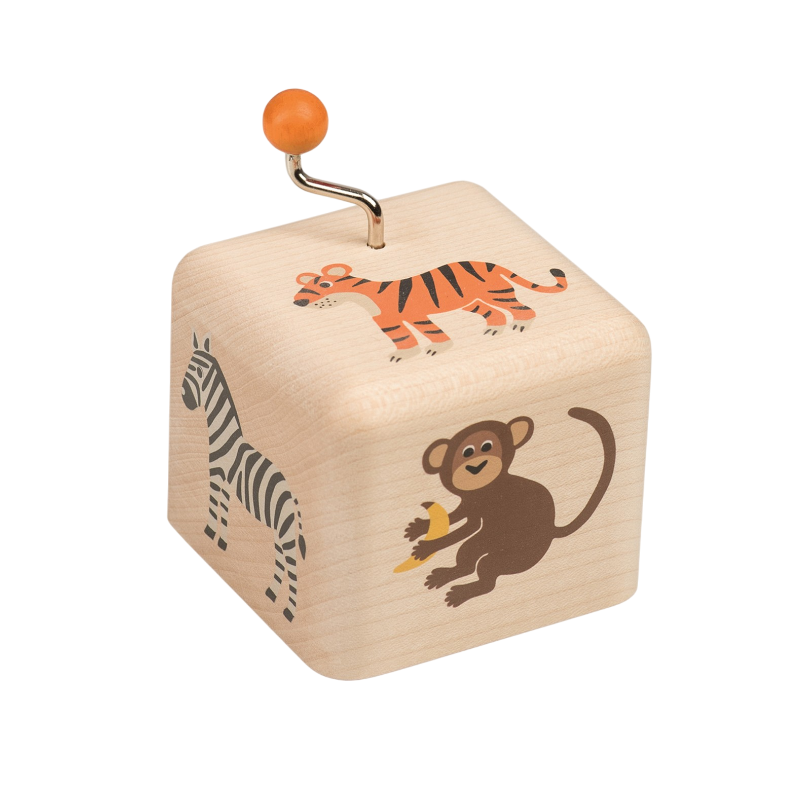 The "Wild" sound cube from Kiener transports children to a distant, wild world. Zebra, tiger and monkey adorn the wooden surfaces and wait until your child turns the crank and the music fills the room. Every note becomes the sound of the savannah, the rustling of the jungle, the call of exotic birds. Children can not only listen, but also actively create role-playing games: The monkey dances, the zebra runs, the tiger creeps through the children's room. The cube is suitable for fantasy journeys in the nursery, for musical story time or as a quiet ritual in the evening. Together you can imitate animal sounds, invent movements or spin stories. Made from sustainable Swiss wood and child-friendly colors, it stands for quality and environmental awareness. Kiener combines sound, adventure and craftsmanship to create a toy that awakens curiosity and creativity in equal measure.