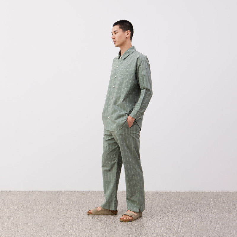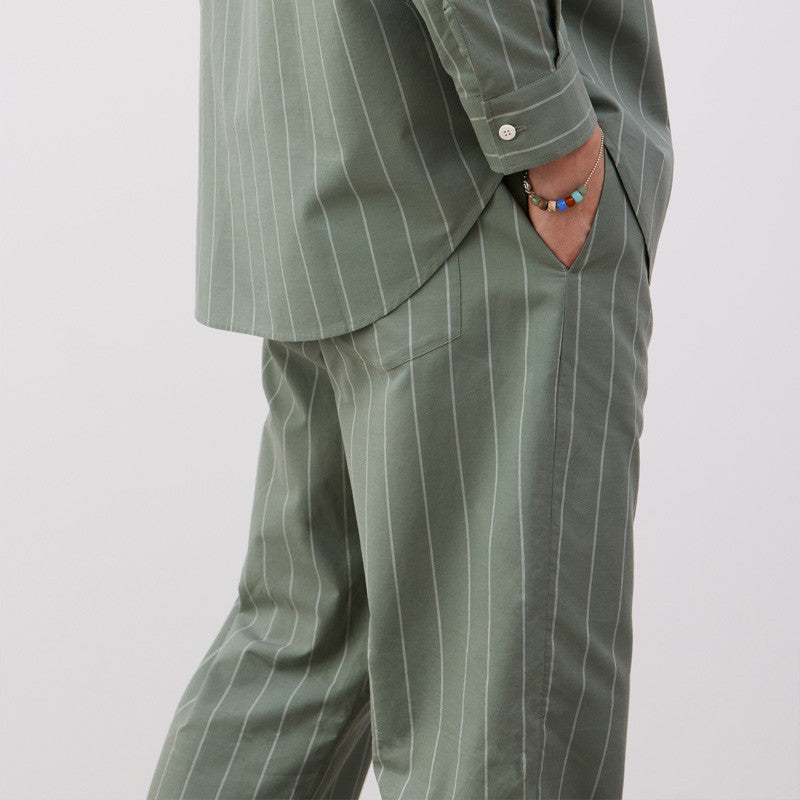 The Yoko trousers in spruce green from Lavie bring the tranquillity of the forest into your everyday life. Made from soft organic cotton, they combine naturalness with comfort and understated elegance. The delicate pinstripes are reminiscent of sunbeams falling through treetops - quiet, rhythmic, clear. Their wide cut allows freedom of movement, whether for a relaxed morning ritual, an afternoon in the studio or a stroll through the neighborhood. The elasticated waistband with drawstring sits softly on the hips without constricting - ideal for moments when you need to reconnect with yourself. With these trousers, Lavie has created a piece of clothing that is unagitatedly stylish and leaves room for your own pace. For people who live consciously and want to find themselves in their clothes.