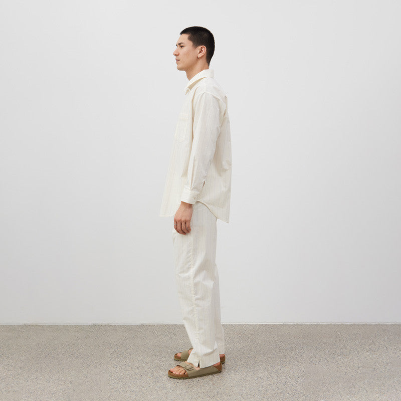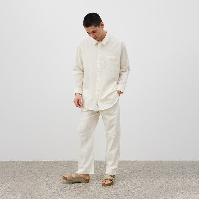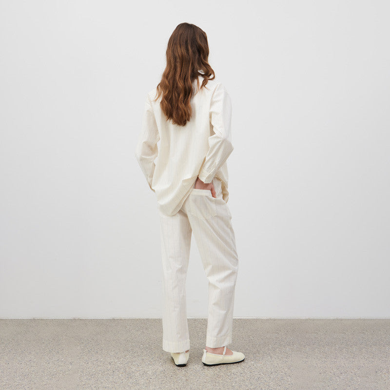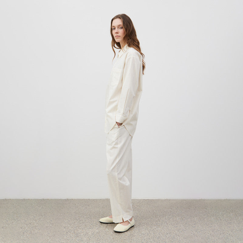 The Yoko trousers in Sky by Lavie are a silent promise of lightness and clarity. Made from soft, breathable organic cotton, they will accompany you through slow days and conscious breaks. The light beige base color with fine stripes is reminiscent of light filtering through curtains - soft, calm and unobtrusive. The elasticated waistband with drawstring gives you freedom of movement and comfort, whether you're reading at home, working in the studio or having breakfast barefoot on the balcony. The wide cut brings serenity to your look - simple, stylish and effortless. Lavie combines naturalness, quality and everyday style with these trousers - for people who want to feel comfortable in their clothes, without compromise.