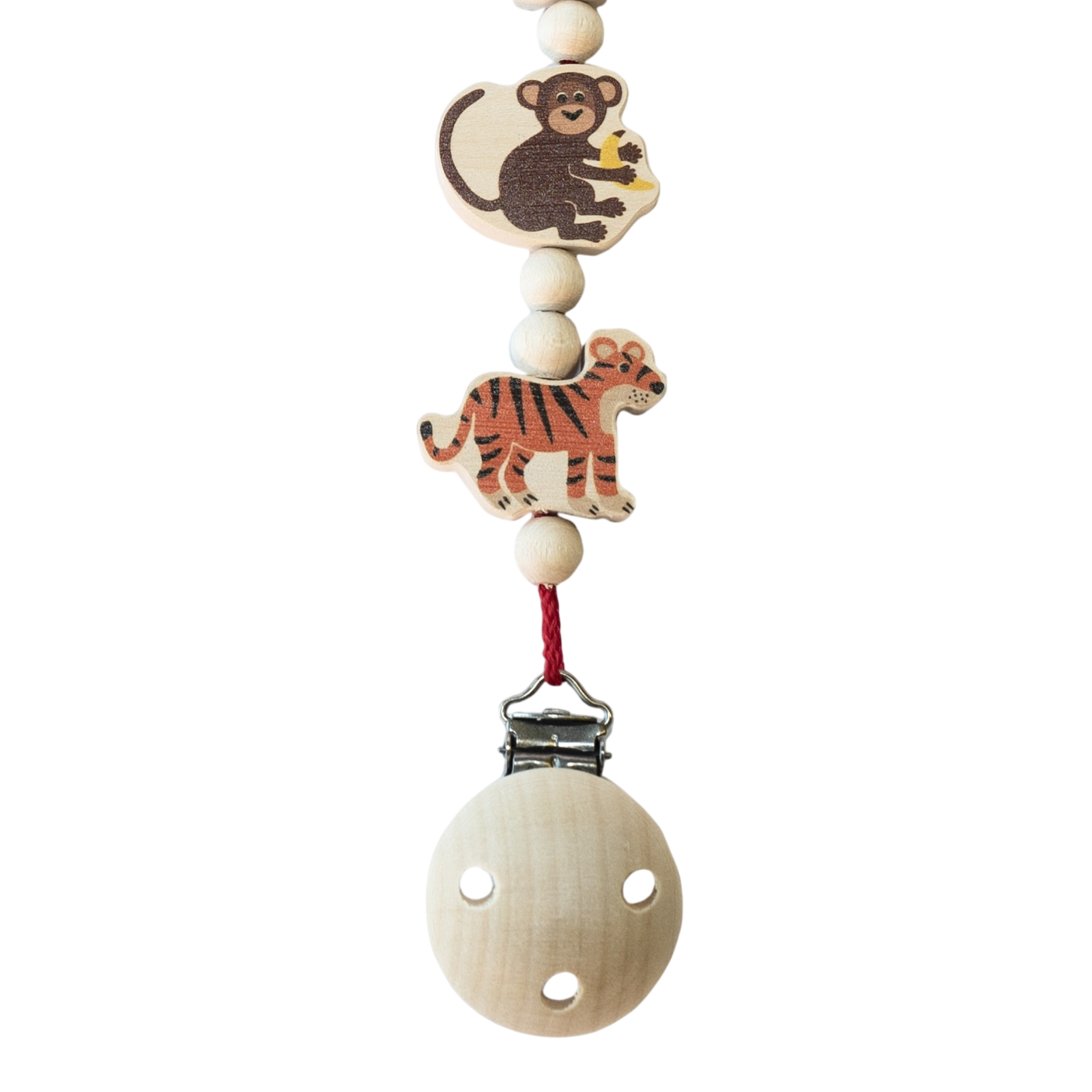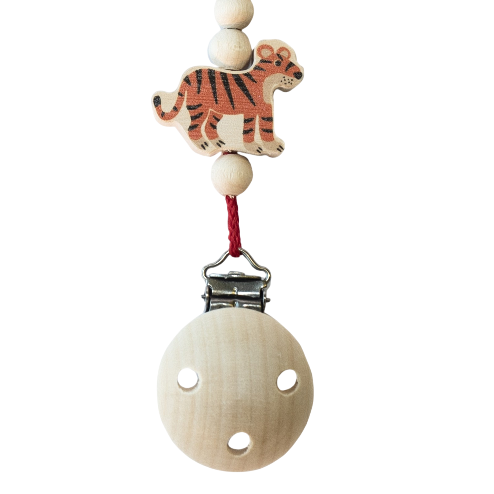 La sucette "Wild" de Kiener transforme chaque sucette en une petite expédition. Entre les perles de bois délicatement polies se trouvent une girafe, un singe, un pingouin et un tigre - des figures qui ne sont pas seulement jolies, mais qui deviennent des personnages vivants dans les petites mains. En les suçant, ton enfant peut toucher les différentes formes, nommer les animaux et inventer des histoires : Comment le singe vole une banane, le tigre parcourt la jungle ou le pingouin se dandine courageusement vers la rive. Fabriquée en bois suisse de qualité supérieure et soigneusement peinte à la main, la chaîne permet de fixer la sucette en toute sécurité à la poussette, aux vêtements ou à l'écharpe de portage. Le clip solide empêche de perdre la sucette et offre la tranquillité aux parents. Kiener associe ainsi imagination et fonctionnalité : Ton enfant vit son propre safari, tandis que la sucette reste toujours à portée de main. La chaîne vous accompagne à l'extérieur comme à l'intérieur, lors des promenades, des trajets en voiture ou des moments de câlins tranquilles.