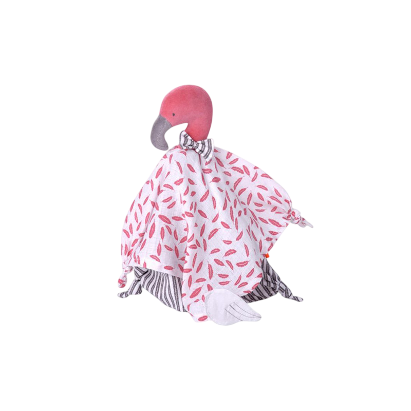 Doudou Flamingo doux, à deux couches avec un petit papier crépitant dans les plumes. Les plumes sont des petites caresses pour les mains. Des sentiments tels que la sécurité, le bien-être, la confiance, etc. sont des besoins primaires qui peuvent être compris et vécus à travers un objet tel que le doudou.