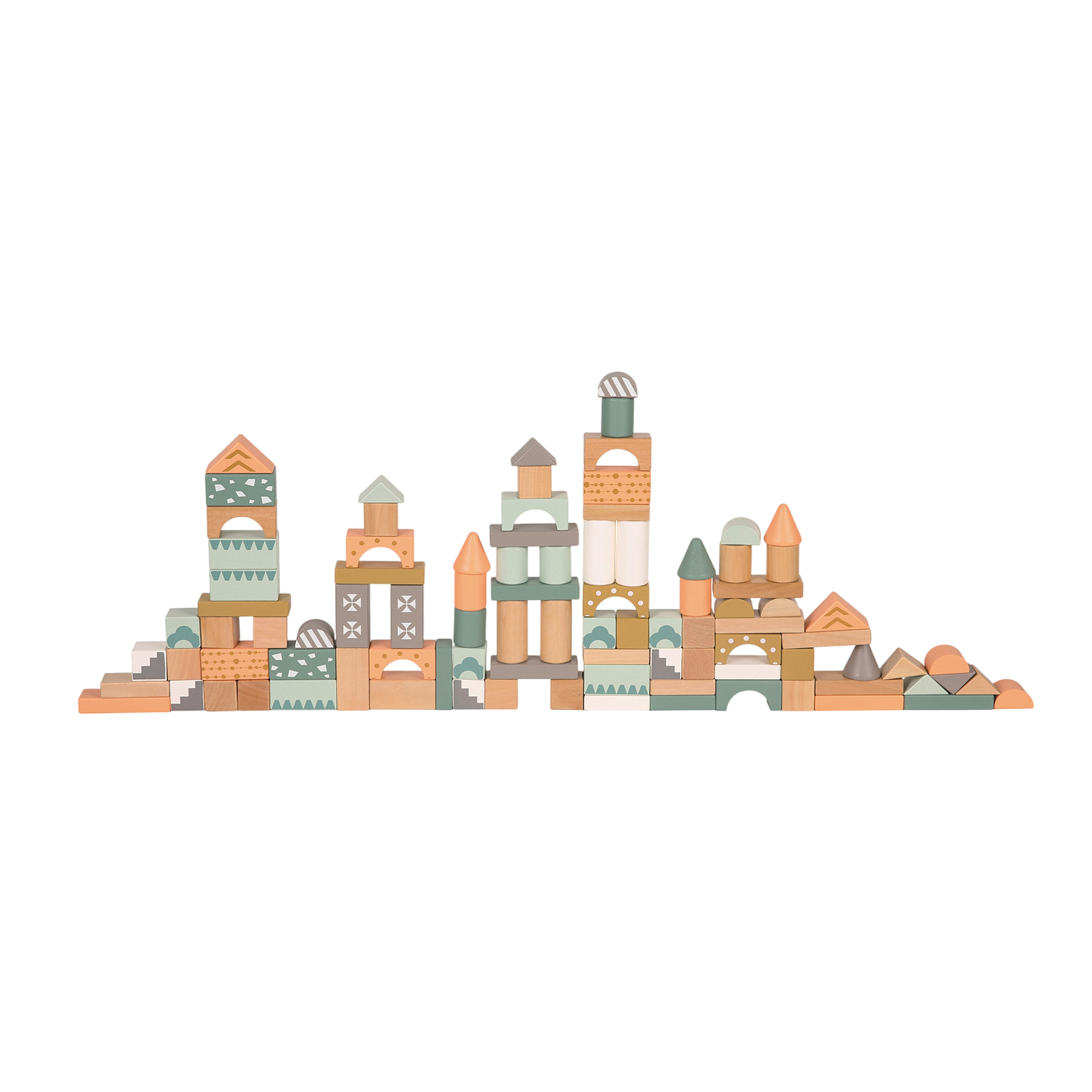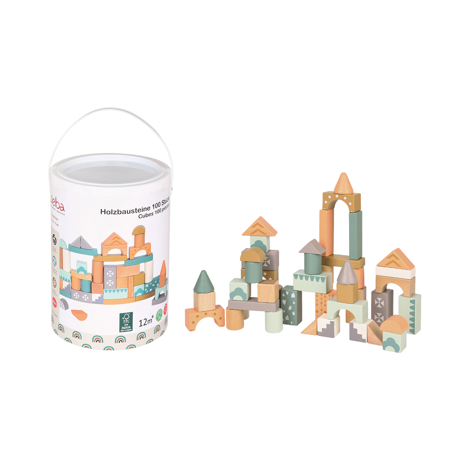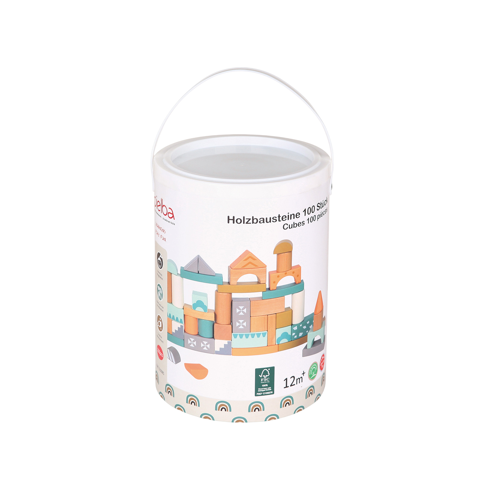 Le classique parmi les jouets. Boîte de 100 blocs de construction en bois (3 cm), emballés dans un tambour en carton solide. Dès l'âge d'un an, les enfants peuvent jouer avec les briques de construction et développer leur motricité et leur coordination.