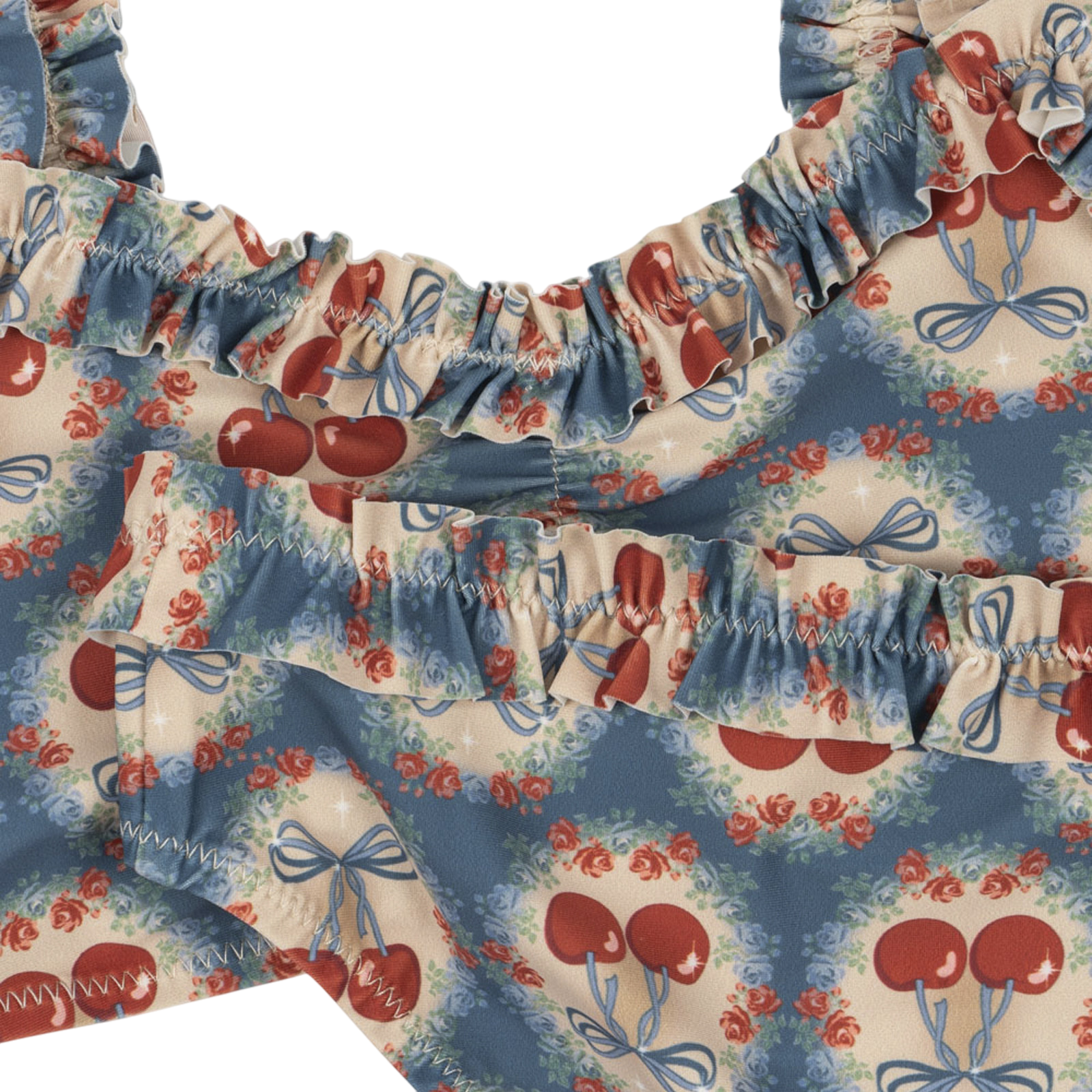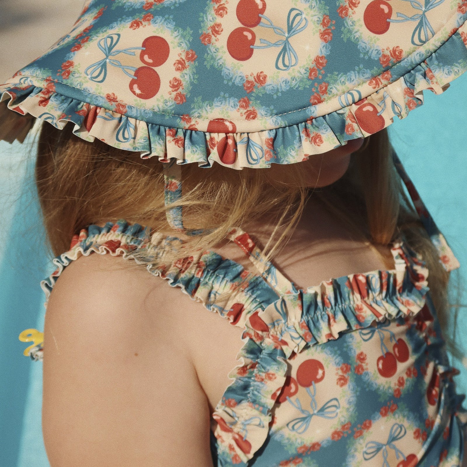 Der Bikini Maya Cherry Bow Blue von Konges Sløjd in einem bezaubernden Kirschdesign auf einem sanften blauen Hintergrund bringt Sommerfreude und Leichtigkeit in den Alltag. Die fröhlichen Kirschen und das zarte Design lassen die Sonne erstrahlen, während die Rüschen entlang des Oberteils und der Hose eine verspielte Eleganz verleihen. Dieser Mädchen Bikini ist ein echter Blickfang und bietet dank der elastischen Materialien auch eine perfekte Passform und viel Bewegungsfreiheit für kleine Wasserratten. Ob beim Planschen im Pool, beim Strandabenteuer oder bei einem Sommertag im Garten – dieser Bikini wird jedes Abenteuer zu einem unvergesslichen Erlebnis. Dieses Modell ist auch als ganzer Badeanzug für Mädchen erhältlich.