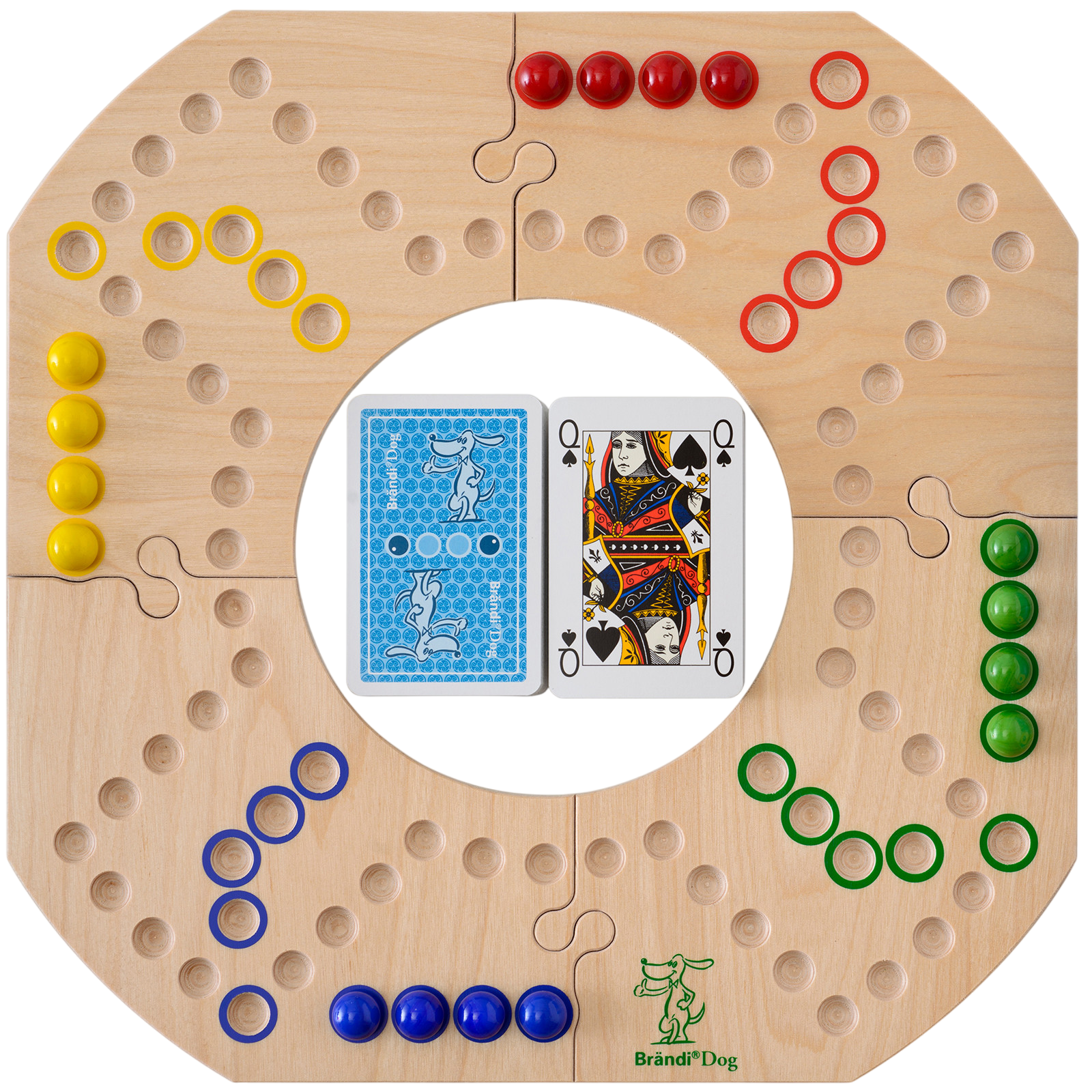 Spannung, Taktik und Glück - Brändi Dog ist ein spannendes Brettspiel mit Langzeitmotivation, das im Team und mit Bridge-Karten gespielt wird. Es hat Ähnlichkeiten mit Eile mit Weile", ist aber durch die taktischen Elemente viel variantenreicher."