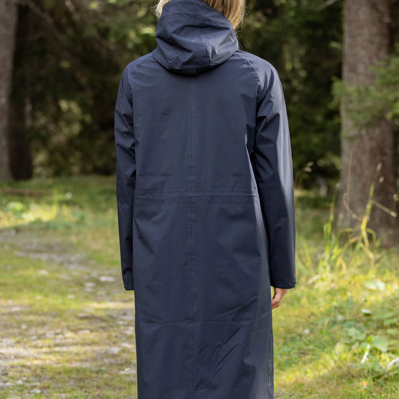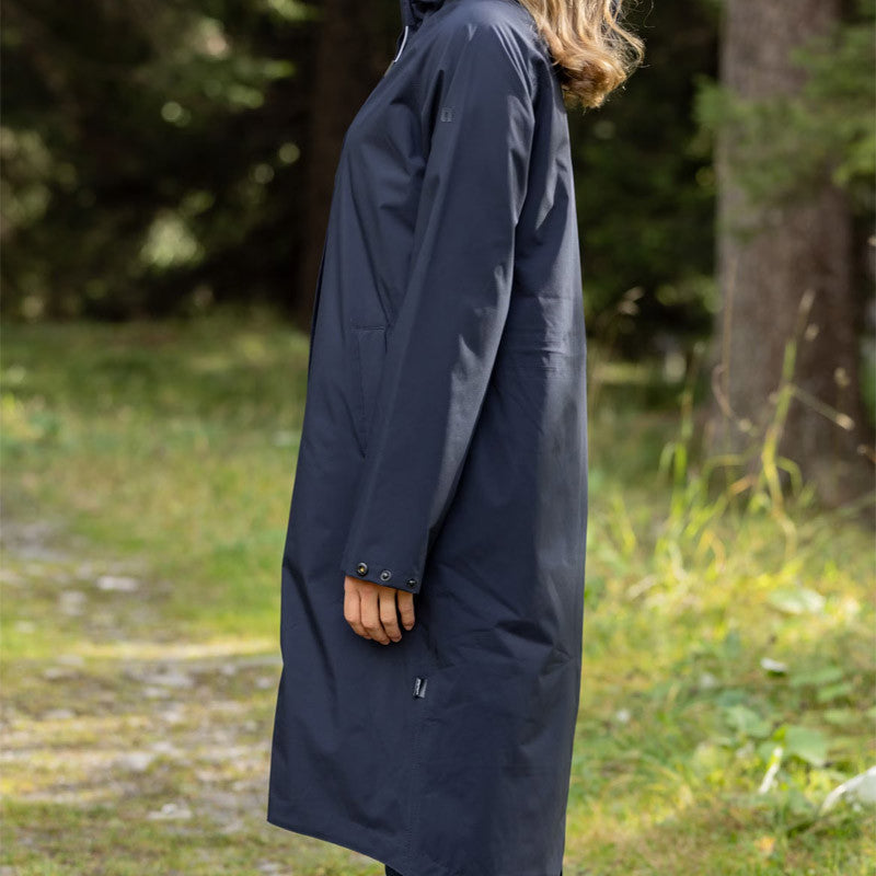 Der Frauen Regenmantel Chana in Dark Navy von Rukka bietet zuverlässigen Schutz bei Regen und Wind, ohne dabei auf Stil zu verzichten. Das wasserdichte und winddichte Material hält Feuchtigkeit effektiv ab, während die atmungsaktive Membran für ein angenehmes Tragegefühl sorgt. Der lange Schnitt schützt zusätzlich vor Nässe und hält auch an kühlen, windigen Tagen angenehm warm. Eine verstellbare Kapuze bietet zusätzlichen Schutz, während wasserdichte Reissverschlüsse das Eindringen von Feuchtigkeit verhindern. Die dezente dunkelblaue Farbe verleiht dem Mantel eine elegante, zeitlose Optik, die sich mühelos in jede Garderobe integrieren lässt. Ob auf dem Weg zur Arbeit, beim Stadtbummel oder bei einem Spaziergang am See – dieser Mantel kombiniert Funktionalität mit modischer Vielseitigkeit. Ergänzt mit einer Rukka-Regenhose entsteht ein vollständiger Wetterschutz für unbeständige Tage.