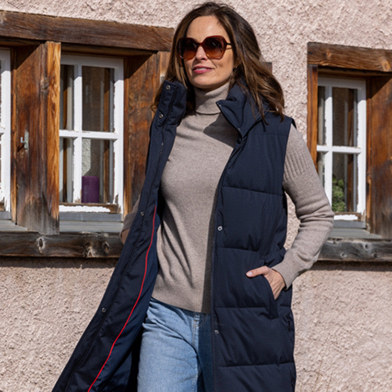 Agnes. Das lange Gilet mit no-down Wattierung hält den Körper wunderbar warm und lässt sich hervorragend mit einem schönen Fleece oder Strick kombinieren. So entsteht ein stilvolles und zugleich funktionales Outfit für die kalten Tage.