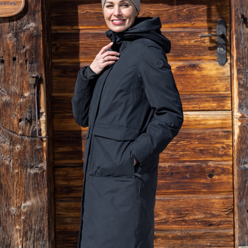 Gwen. Der lange Wintermantel - ist nicht nur absolut wetterfest, sondern auch ein Blickfang. Sein schlichtes Design wird durch ein liebevoll bedrucktes Innenfutter verschönert, welches in Zusammenarbeit mit einer talentierten Schweizer Künstlerin entwickelt wurde.
