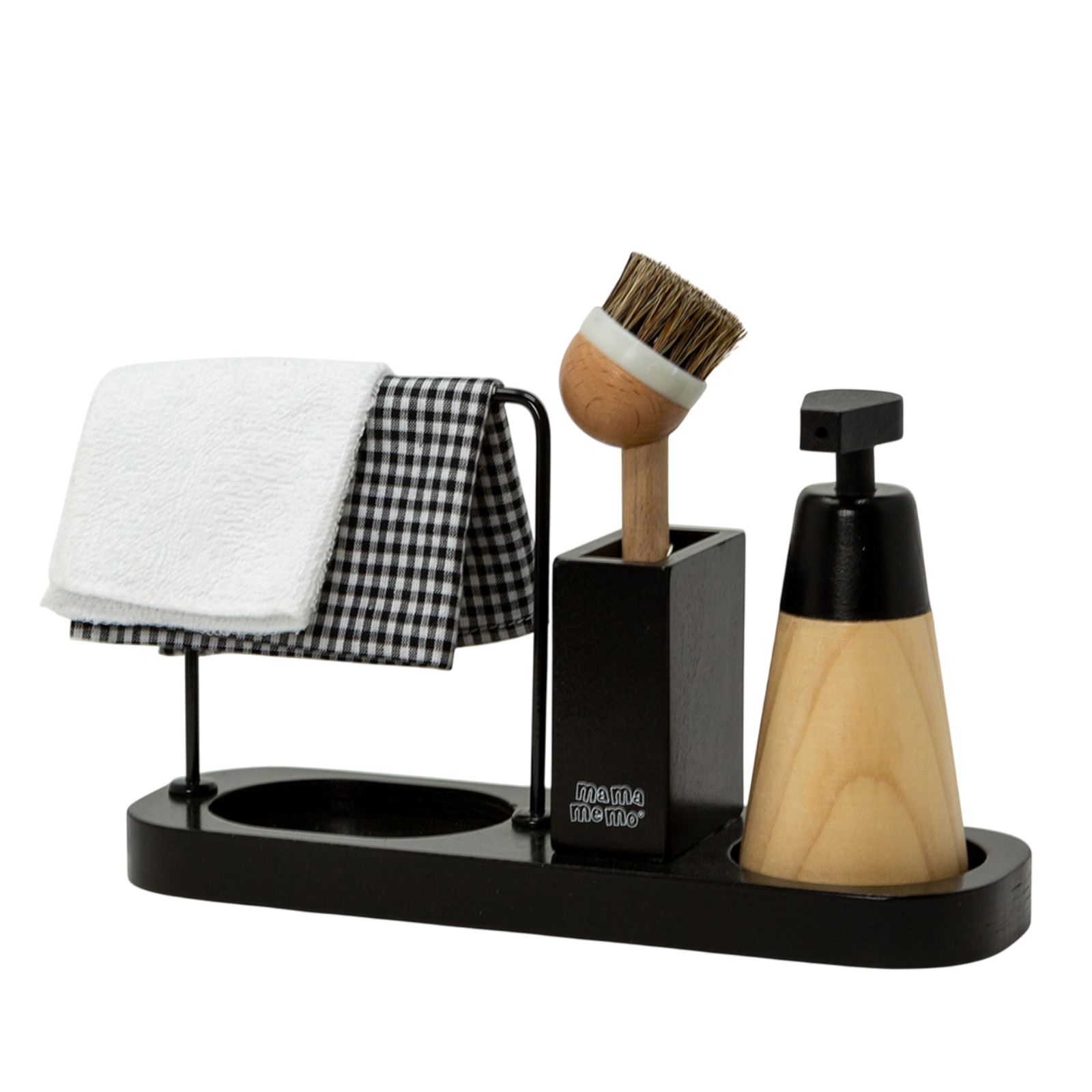 Das Mamamemo Geschirrspülset ist ein kleines, aber vielseitiges Zubehör für die Kinderküche. Es enthält eine Bürste, eine Seifenflasche und zwei Handtücher, die auf einem stilvollen Ständer arrangiert sind. Kinder können damit spielerisch das Spülen nachahmen und ihren eigenen kleinen Haushalt führen. Ob sie Puppengeschirr waschen oder die Küche ihrer Kuscheltiere aufräumen - dieses Set regt zu kreativen Rollenspielen an und schult gleichzeitig Feinmotorik und soziale Kompetenzen. Das minimalistische Design und die hochwertigen Materialien passen ideal in jede Spielküche. Es ist nicht nur ein Lernspielzeug, sondern auch eine Einladung, alltägliche Aufgaben mit Freude nachzuspielen. Perfekt für Kinder, die Spass daran haben, den Alltag zu entdecken.