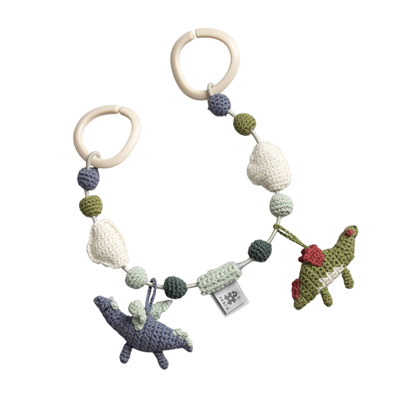 Handgehäkelte Kinderwagenkette mit Figuren aus Bio-Baumwolle aus der Dragon-Tales-Kollektion von Sebra, einer Kollektion, die Geschichten über Drachen und Ritter erzählt.