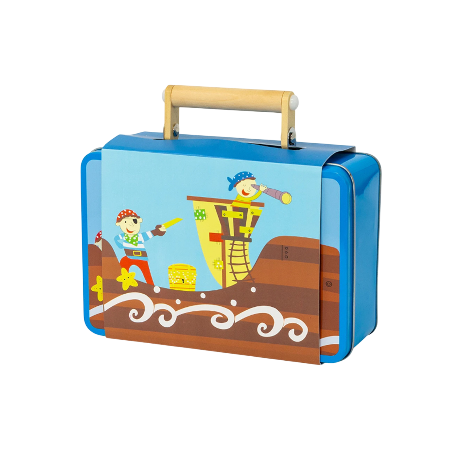 Mit dem Piratenkoffer von Mamamemo beginnt jedes Abenteuer schon beim Aufklappen. Der stabile Koffer aus Metall mit praktischem Holzgriff ist mit fröhlichen Piratenmotiven gestaltet und weckt sofort die Lust, in ferne Welten aufzubrechen. Kinder können darin ihre Schätze, Spielzeug oder kleine Geheimnisse sicher verstauen und überallhin mitnehmen.