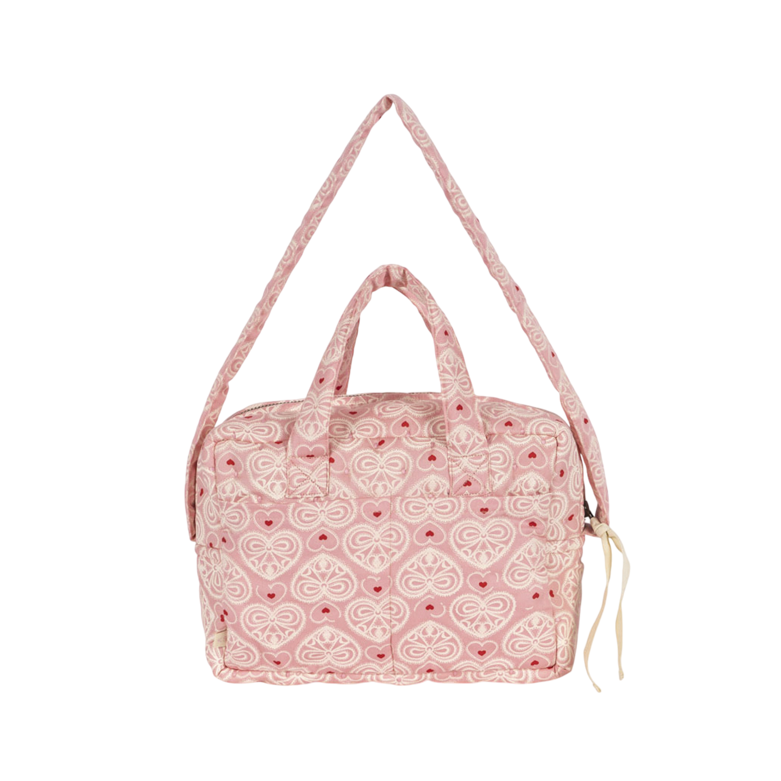 Die Puppen Wickeltasche Lacy Pink von Konges Sløjd ist das ideale Accessoire für kleine Puppenmütter und -väter. Mit ihrem bezaubernden, zarten Herzmuster in sanften Rosatönen und einer praktischen Funktionalität wird diese Tasche schnell zum Lieblingsbegleiter im Spiel. Aus robustem, hochwertigem Material gefertigt, bietet sie ausreichend Platz, um alle wichtigen Utensilien für das Puppen- und Kuschelspiel zu verstauen. Die Tasche verfügt über praktische Tragegriffe sowie einen verstellbaren Schultergurt, sodass sie sowohl in der Hand als auch über der Schulter getragen werden kann. Perfekt für Ausflüge mit der Puppe oder für kreative Rollenspiele zu Hause. Die Puppenwickeltasche Lacy Pink ist nicht nur funktional, sondern auch ein hübsches Accessoire, das das kreative Spielen fördert und gleichzeitig ordentlich hält. Ein tolles Geschenk für Kinder, die es lieben, ihre Puppen zu versorgen und zu pflegen.