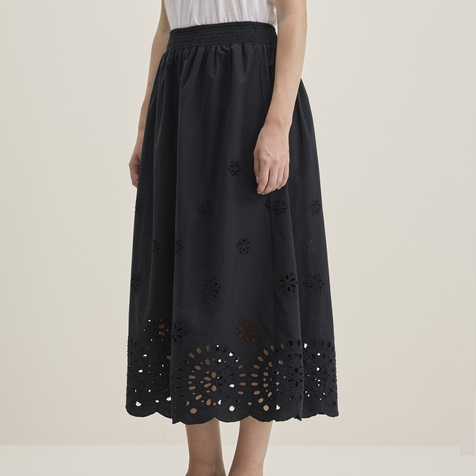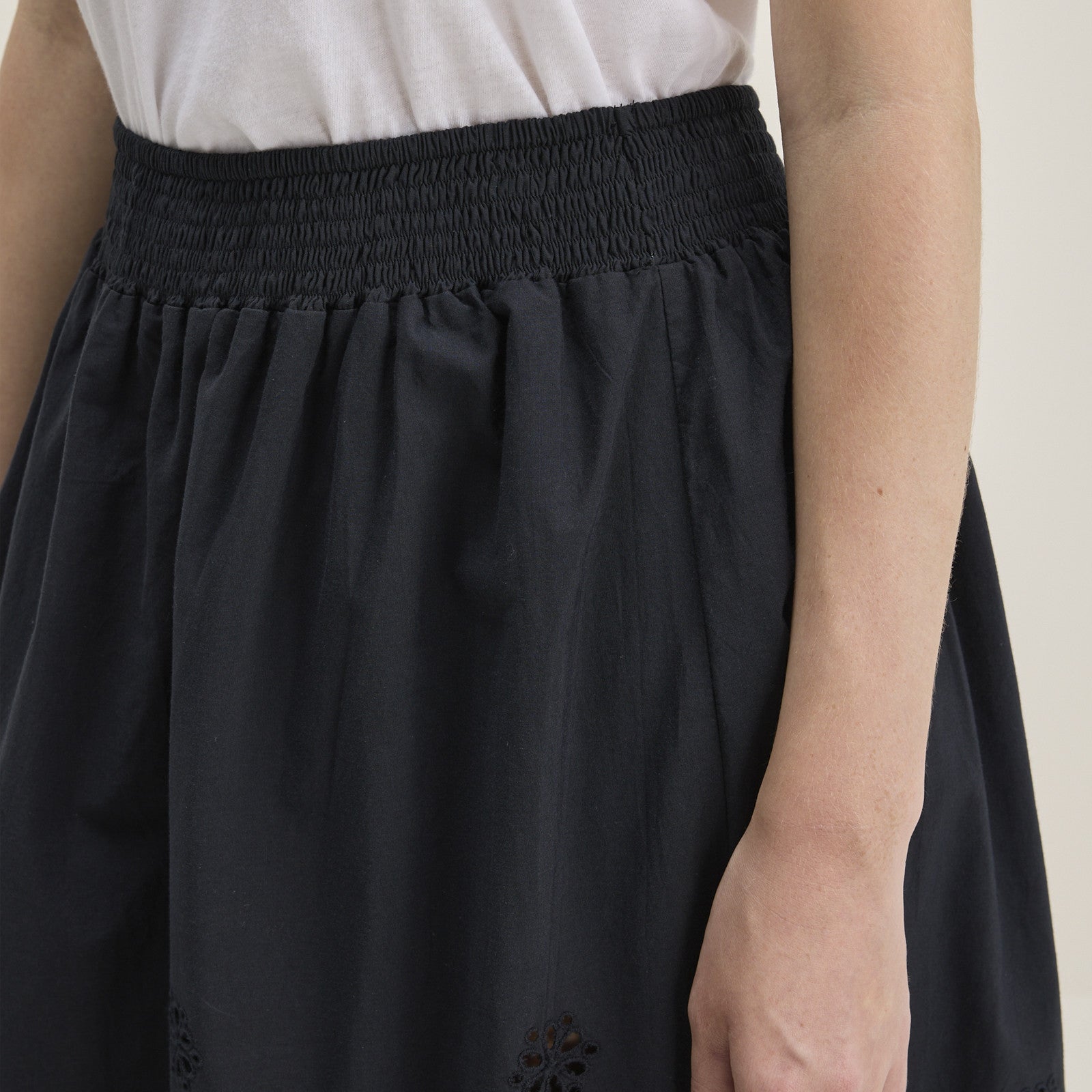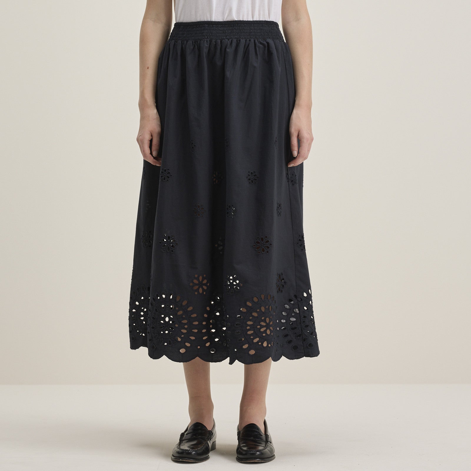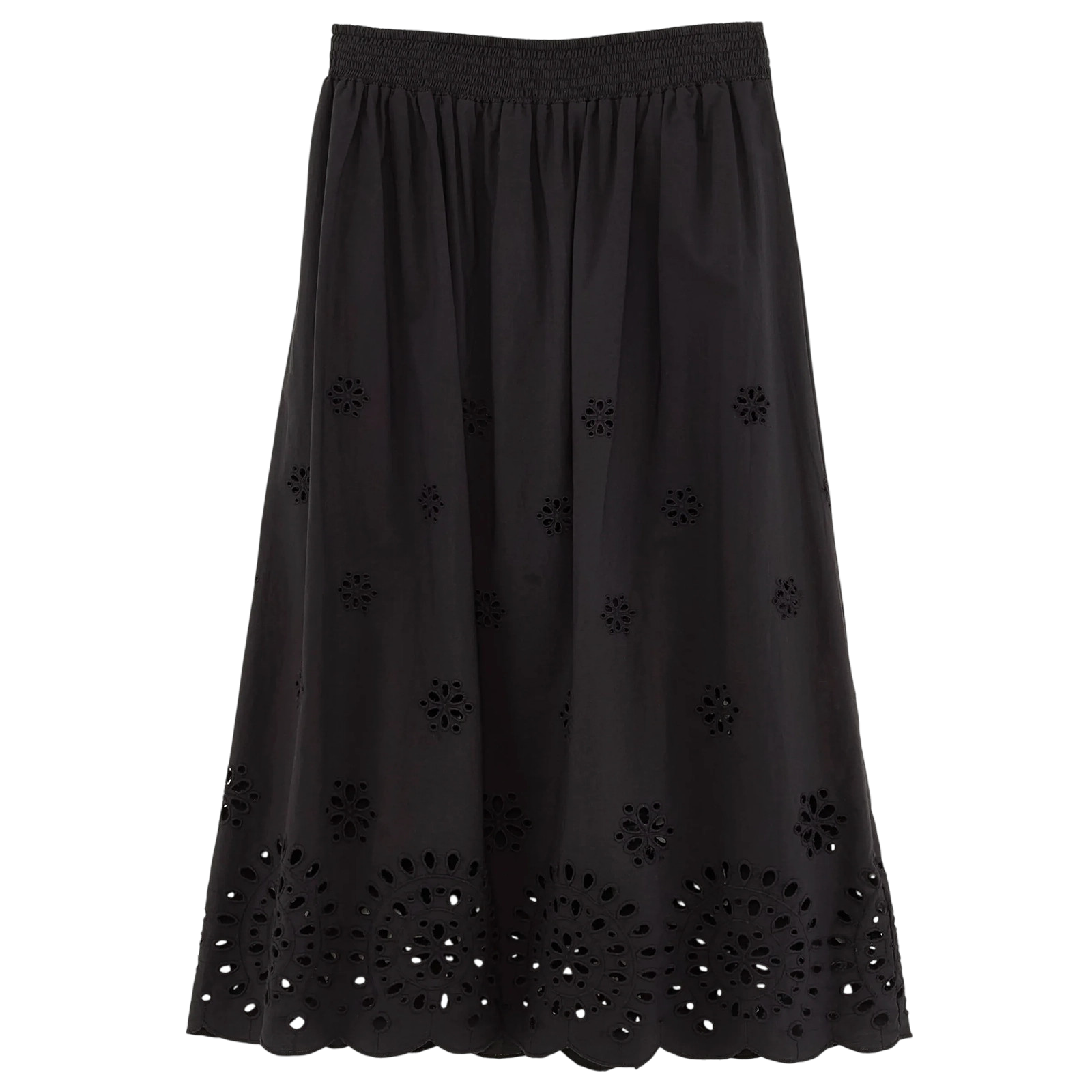Der Rock Dorine von Bellerose in der Farbe Black Beauty verbindet schlichte Eleganz mit einem Hauch von Verspieltheit. Die feinen Lochstickereien und der ausgestellte Schnitt machen ihn zu einem vielseitigen Begleiter, ob für den Alltag oder besondere Anlässe. Der elastische Bund bietet hohen Tragekomfort, während die hochwertige Baumwollqualität einen edlen Fall garantiert. In Kombination mit einem schlichten Oberteil oder einer Bluse wird Dorine schnell zu deinem neuen Lieblingsstück. Perfekt für modebewusste Frauen, die Wert auf Qualität und stilvolles Design legen.