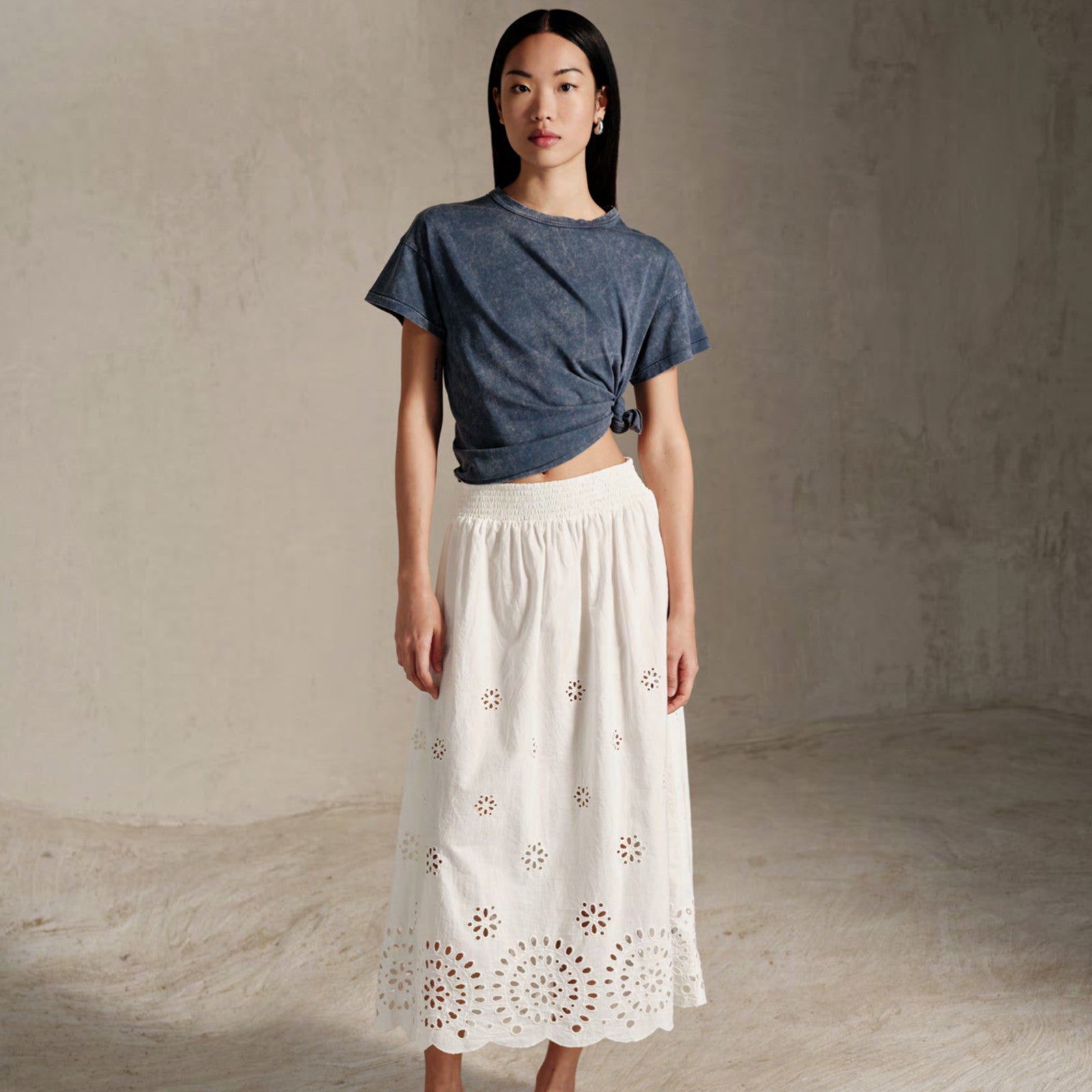 Der Rock Dorine von Bellerose in klassischem Weiss ist eine elegante Wahl für jede Gelegenheit. Der ausgestellte Schnitt und die feinen Lochstickereien verleihen diesem Modell eine besondere Leichtigkeit und feminine Ausstrahlung. Der elastische Bund sorgt für Komfort und eine flexible Passform. Gefertigt aus hochwertigem, luftdurchlässigem Baumwollstoff, ist dieser Rock ideal für warme Tage oder besondere Anlässe. Kombiniere ihn mit einem schlichten Top für einen dezenten Look oder mit auffälligen Accessoires, um das Outfit zu akzentuieren. Bellerose beweist mit Dorine, wie zeitlose Eleganz und modernes Design harmonieren können.