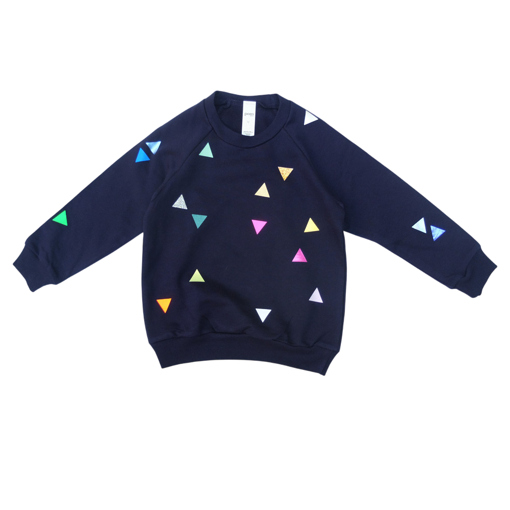 Mit handbedruckten kleinen Dreiecken aus Folie, die in vielen Farben funkeln.