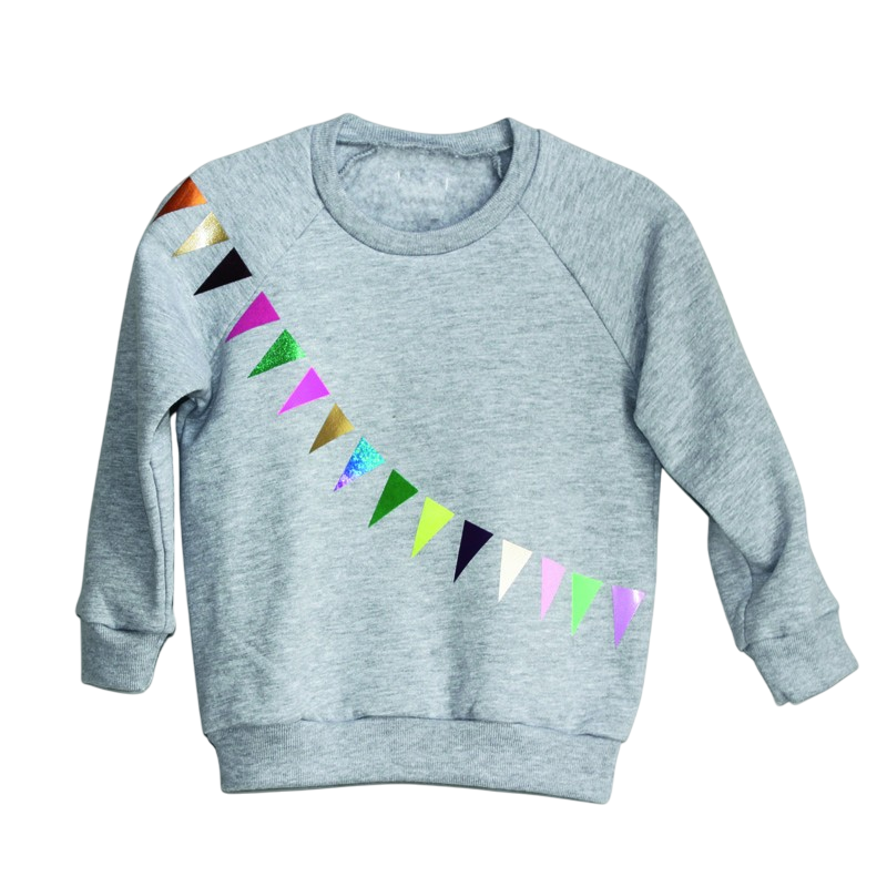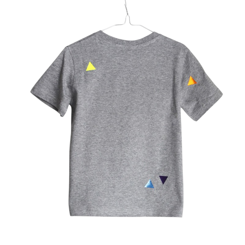 Cooles graues T-Shirt mit handbedruckten Dreiecken! Sie funkeln + leuchten in vielen bunten Farben und manche sind sogar ganz weich.