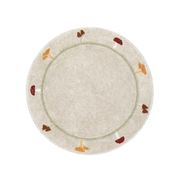 Der runde Chanterelle-Teppich ist mit einer Bordüre aus verschiedenen Pilzarten wie Pfifferlingen und Morcheln verziert, die Flecken aus Leinen mit getufteten Mustern kombiniert. Der Teppich hat eine natürliche Basis, einen inneren Kreis mit etwas längerem Flor in Olive und Designdetails in Honig, Burgunder, Toffee und Elfenbein.