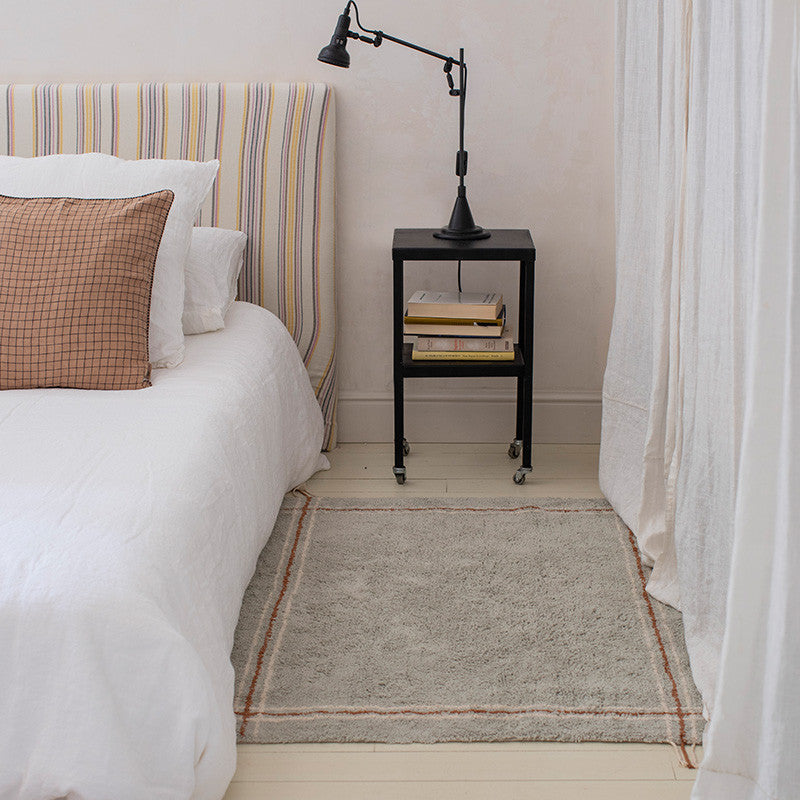 Inspiriert von der traditionell gewebten Küchenwäsche mit Streifen und Karos ist dieser Teppich aus einer gemischten RugCycled-Leinwand gefertigt, mit einem weichen getufteten Baumwollflor in Blue Sage auf der Oberseite und einem dünnen Streifenmuster in Natural und Toffee entlang der Kanten. An zwei Ecken sind die Streifen mit handgefertigten, dünnen Borten fortgesetzt.