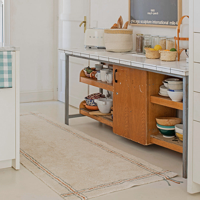 Inspiriert von der traditionell gewebten Küchenwäsche mit Streifen und Karos ist dieser Teppich aus einer gemischten RugCycled-Leinwand gefertigt, mit einem weichen getufteten Baumwollflor in Natur und einem dünnen Streifenmuster in Vintage Blue und Toffee entlang der Kanten. An zwei Ecken sind die Streifen mit handgefertigten, dünnen Borten fortgesetzt.