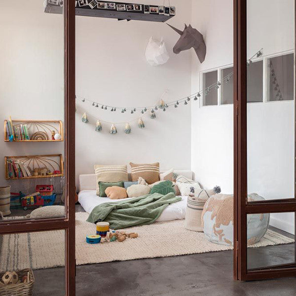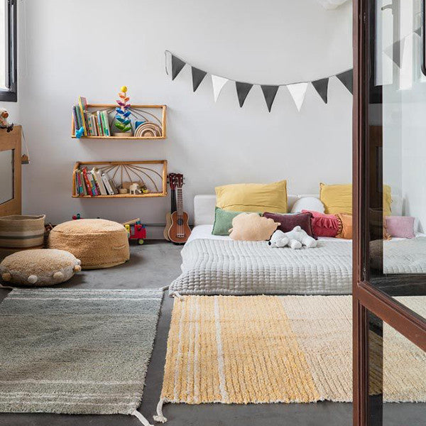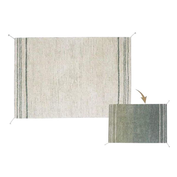 Der Teppich spielt mit sanft wechselnden Farbpaletten im gesamten Teppich und zeigt eine Seite in erdigen Tönen und die gegenüberliegende Seite in neutraleren, natürlichen Tönen. Auf beiden Seiten schliesst das Design mit horizontalen Streifen in einer kontrastierenden Farbe ab und ist in jeder Ecke mit handgefertigten Borten in Naturfarben verziert.
